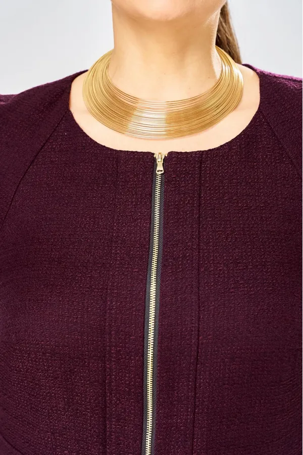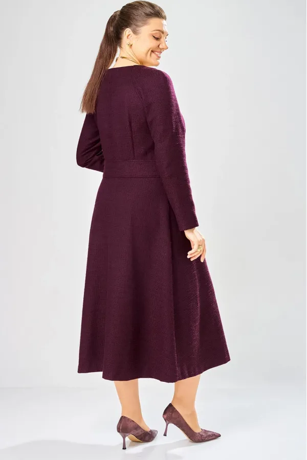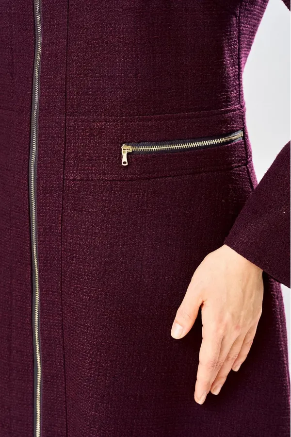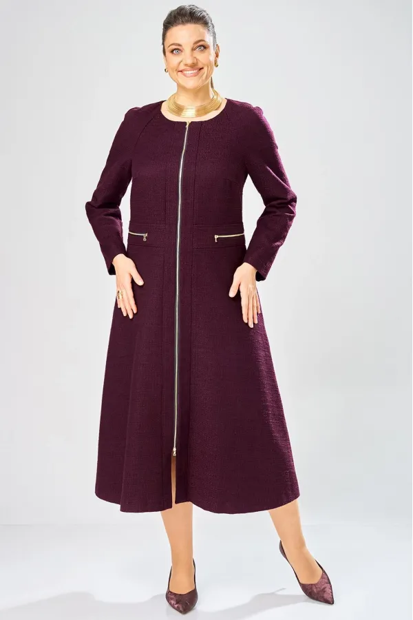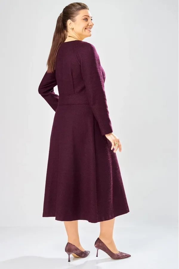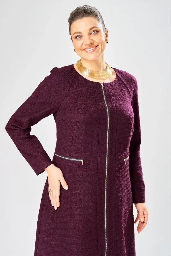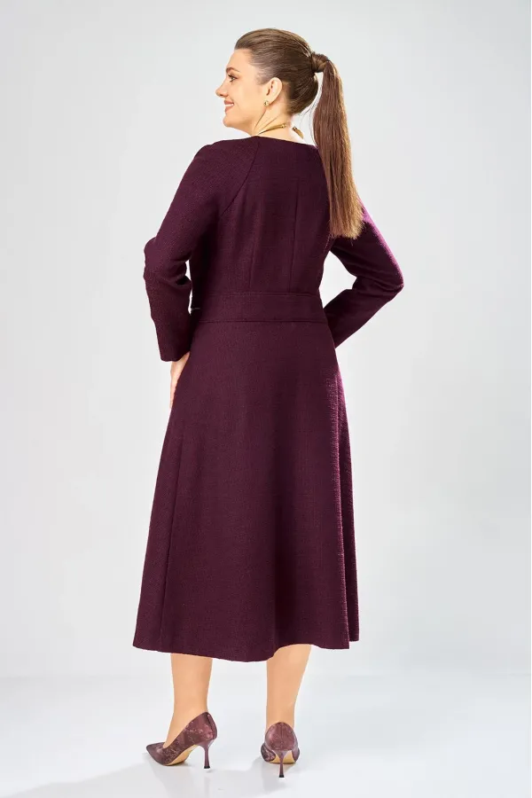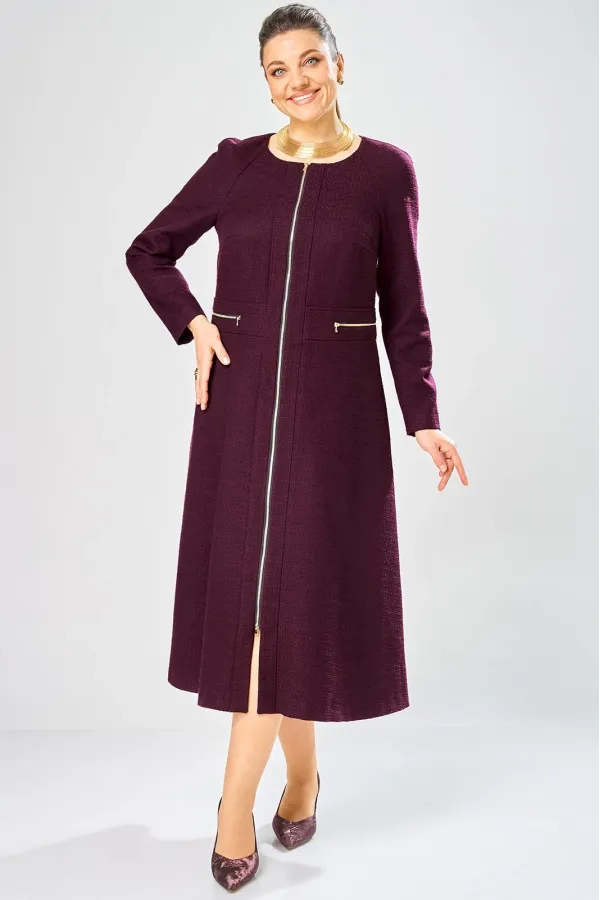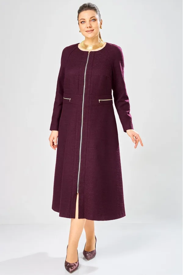 Платье с центральной застежкой на тесьму молния, отрезное по линии талии с широким втачным поясом на поясе обработаны декоративные молнии. Горловина круглая. Рукава реглан с плечевой вытачкой.
