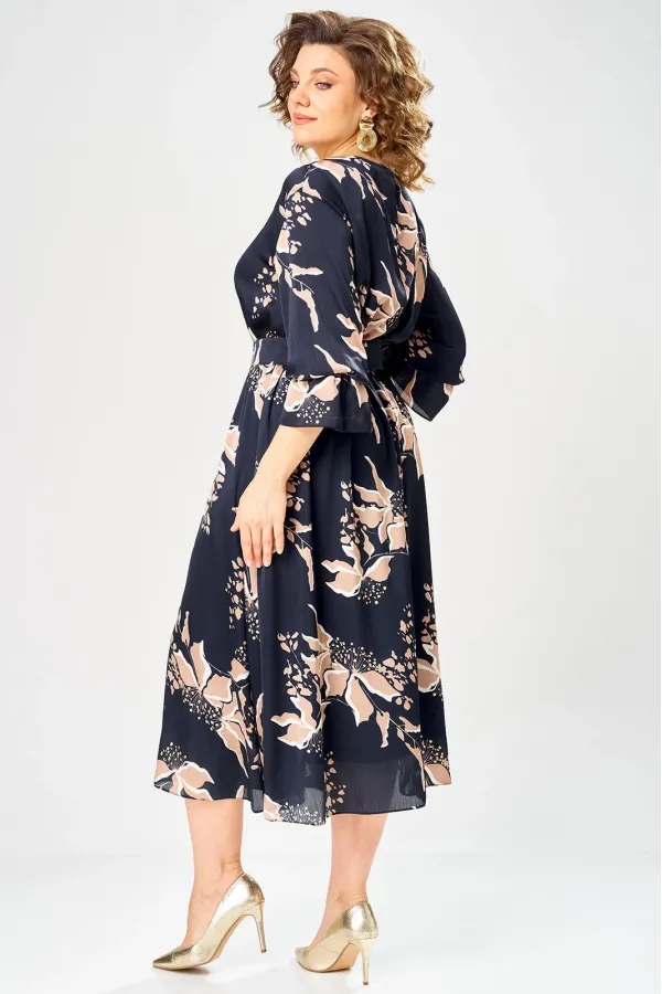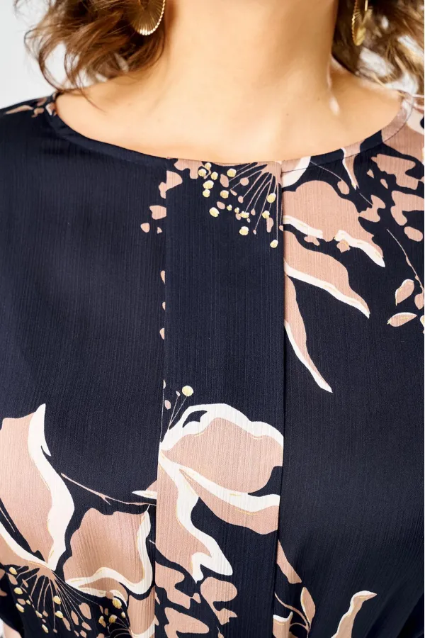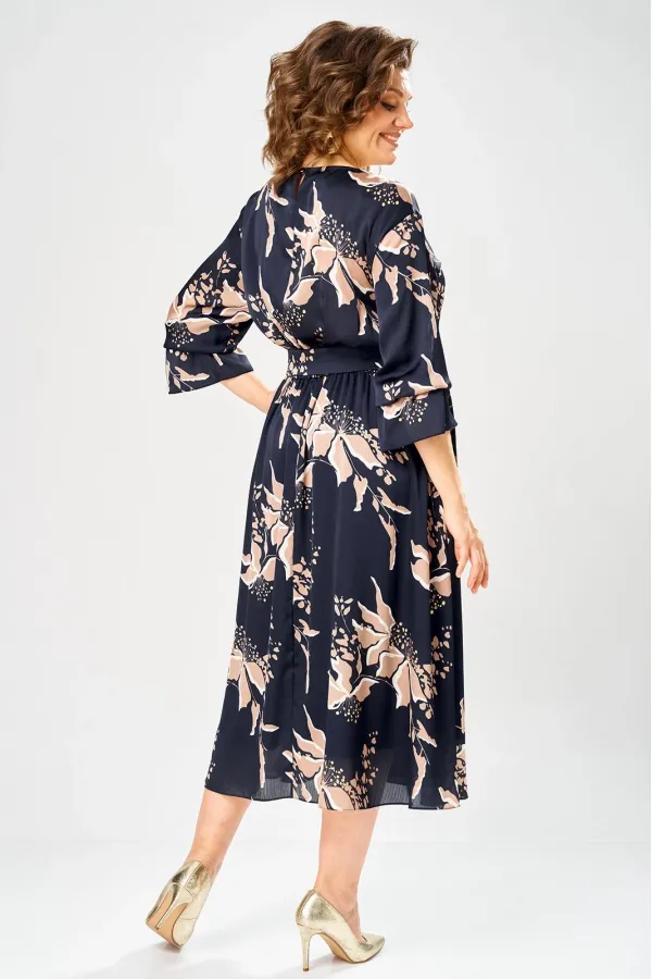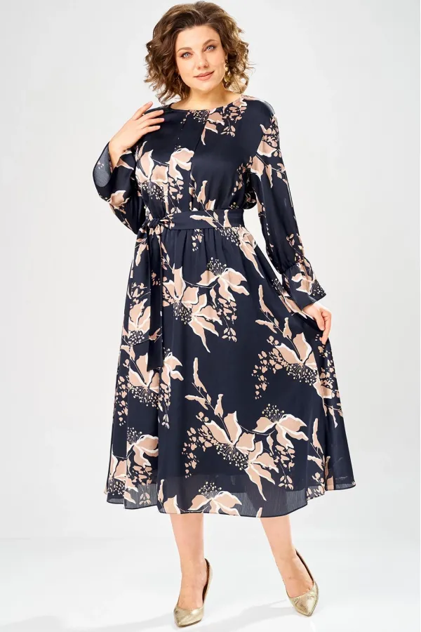 Платье полуприлегающего силуэта, отрезное по линии талии, по центру переда заложена широкая складка, горловина круглая.