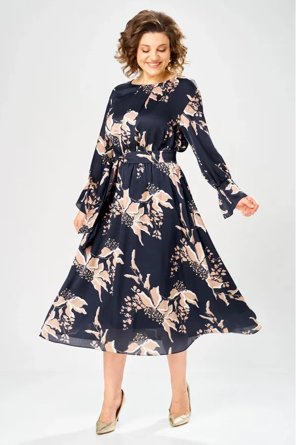Платье женское. Элегантное женское платье из атласной ткани с крэш-эффектом. Платье полуприлегающего силуэта, отрезное по линии талии, по центру переда заложена широкая складка, горловина круглая. Рукава втачные, расши... Читать далее...