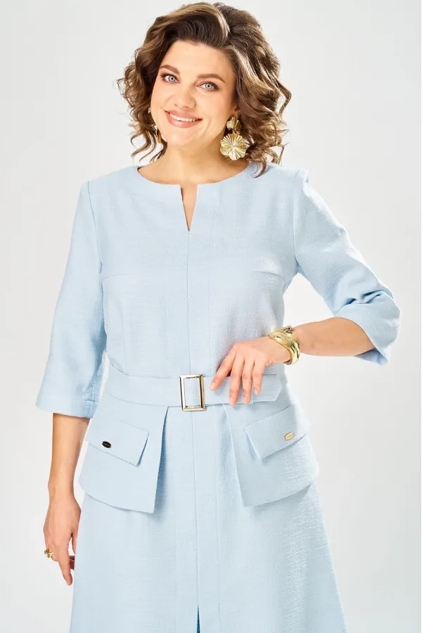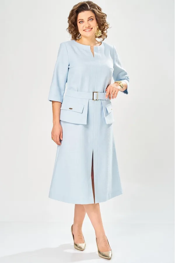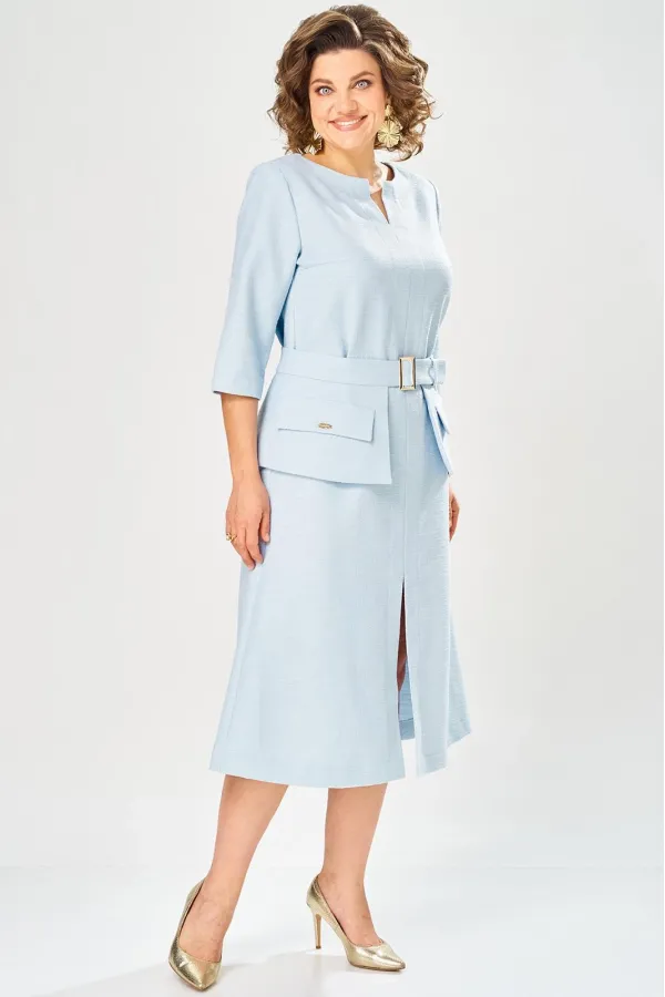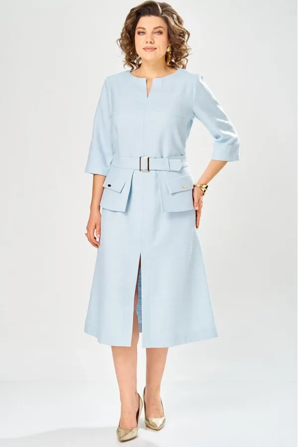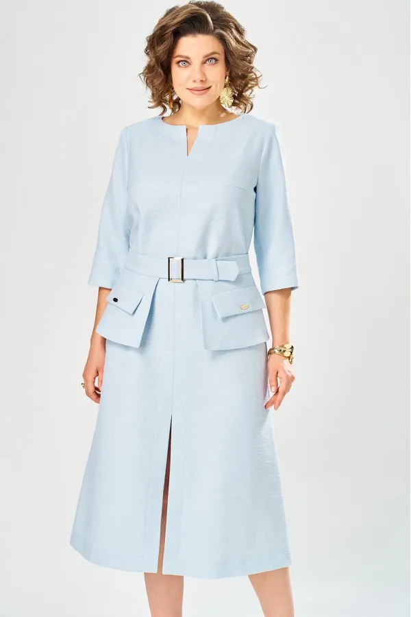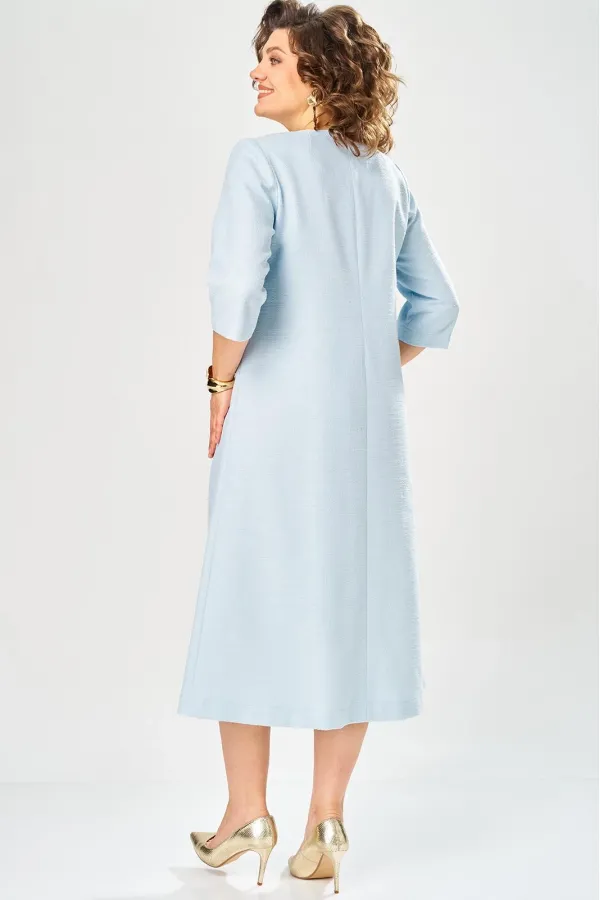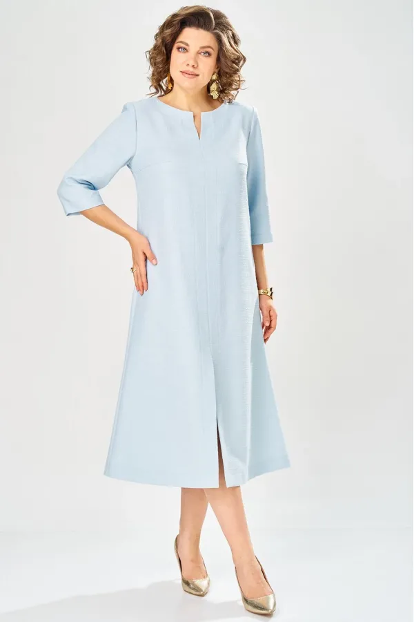 Платье полуприлегающего силуэта, с центральным швом по переду. Горловина круглая с разрезом по центральному шву. Застежка на тесьму молния в центральном шве спинки, рукава втачные, длина 3/4.
