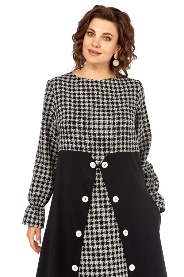 Вечная классика, которая всегда в моде, в платье «Шарм Одри». Платье имитирует сочетание стильного топа с принтом «гусиная лапка» и элегантной юбки-пальто. Это создает эффект многослойности и делает образ более глубоким и интересным, при этом являясь единым цельным нарядом.