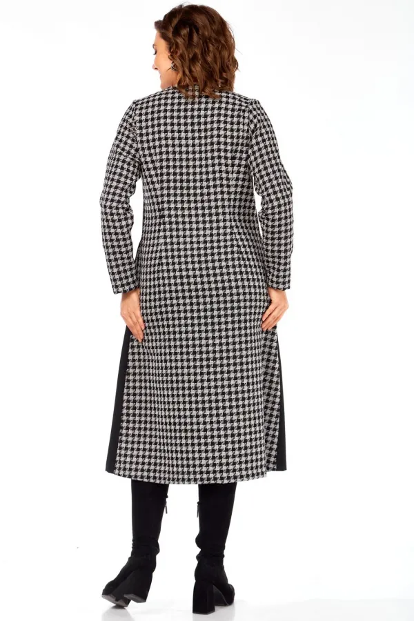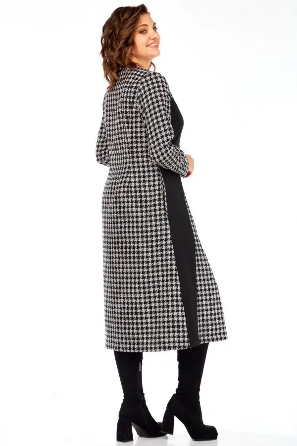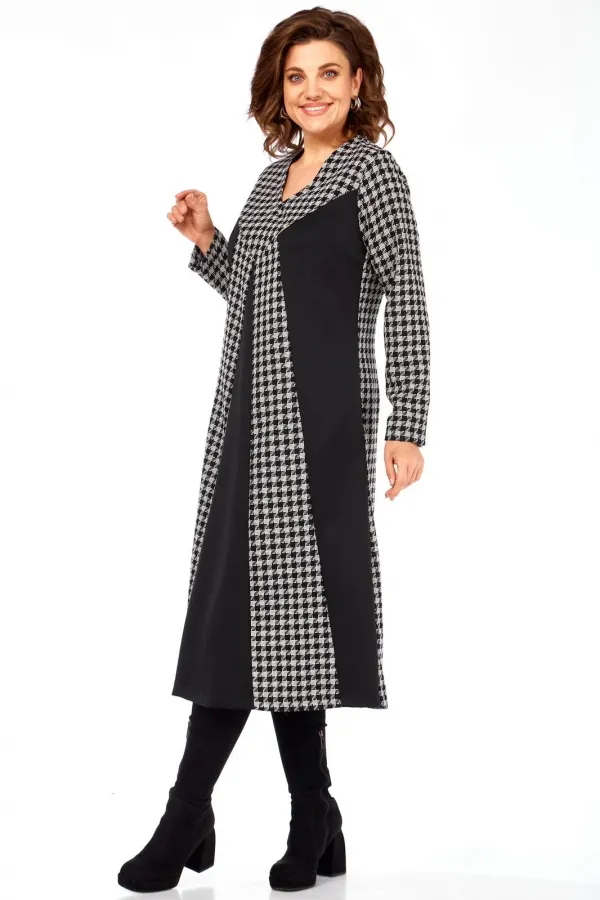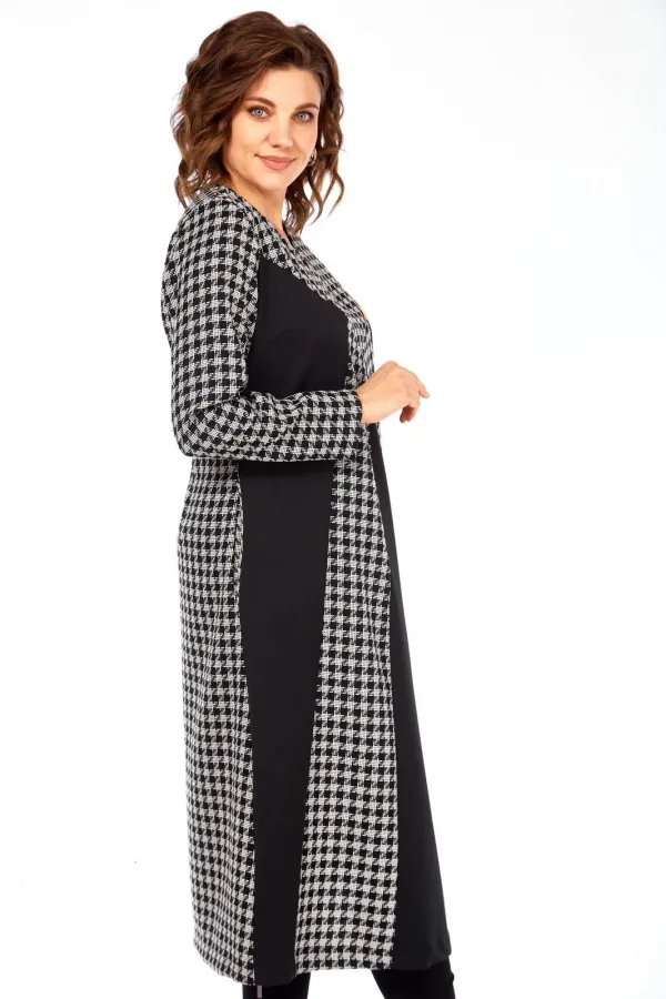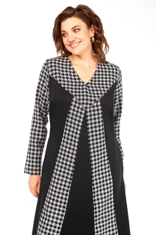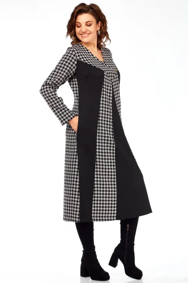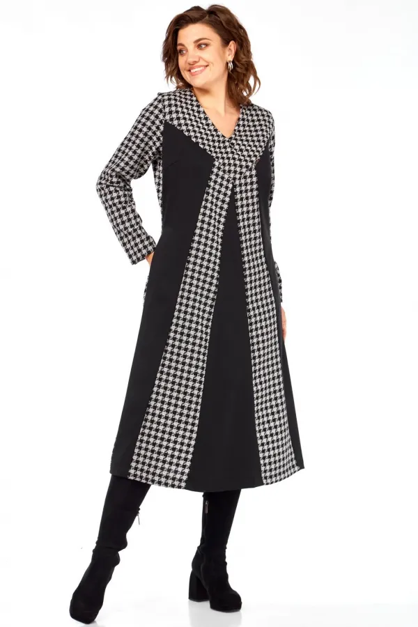Это платье сочетание классического принта гусиная лапка и смелых черных блоков создает уникальный, запоминающийся образ, который точно соберет комплименты. Продуманное расположение вертикальных черных и принтованных панелей визуально вытягивает силуэт, делая вас стройнее и выше. V-образный вырез дополнительно подчеркивает изящество шеи. Благодаря свободному А-силуэту и длине миди, это платье идеально подходит для активного дня – от деловых встреч до культурных мероприятий. Оно одинаково стильно смотрится с каблуками, ботильонами или даже кедами. Это уверенный, строгий и одновременно харизматичный образ для тех, кто предпочитает четкость линий и графическую выразительность, подчеркивающую их индивидуальность и вкус.