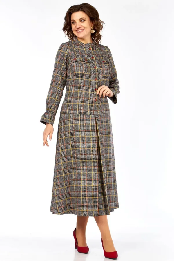 Платье А- силуэта в клетку от Celentano. Воротник-стойка, по полочке и спинке идет подрез чуть ниже линии талии, от которого на полочке выполнена встречная складка. Полочка с центральной застежкой на петли-пуговицы, на... Читать далее...
