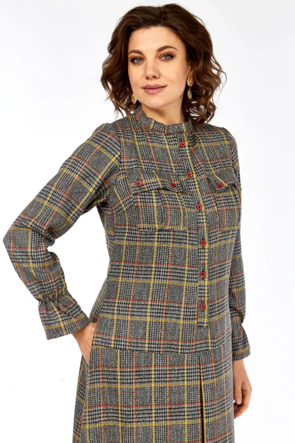 Воротник-стойка, по полочке и спинке идет подрез чуть ниже линии талии, от которого на полочке выполнена встречная складка. Полочка с центральной застежкой на петли-пуговицы, нагрудными вытачками и карманами-хулиганами. Спинка с центральным швом и таллиевыми вытачками. Рукав втачной одношовный на конце манжета с легкой сборкой .