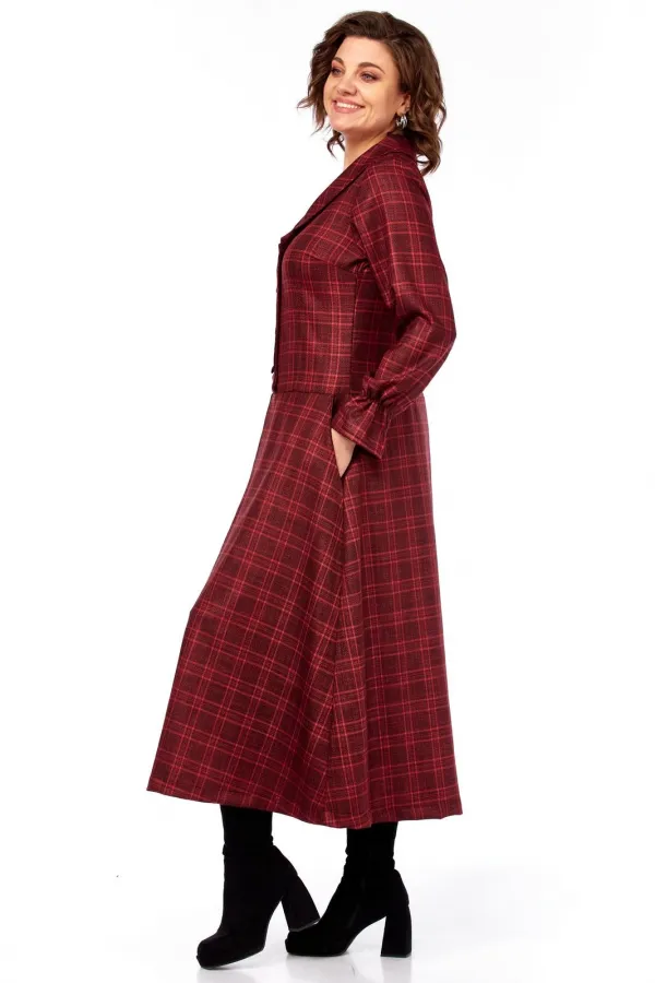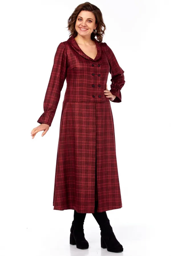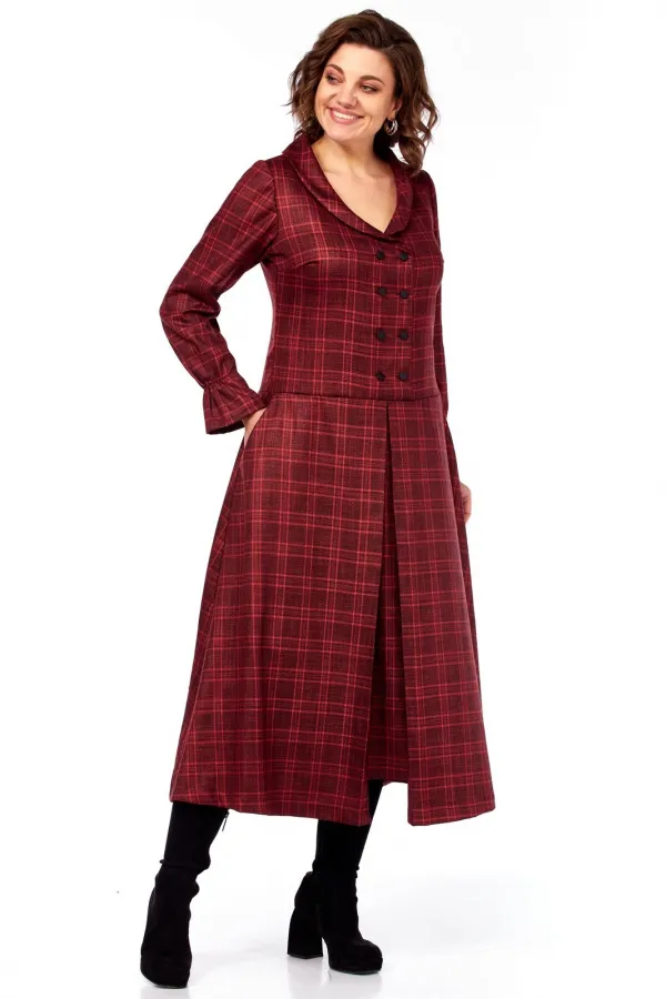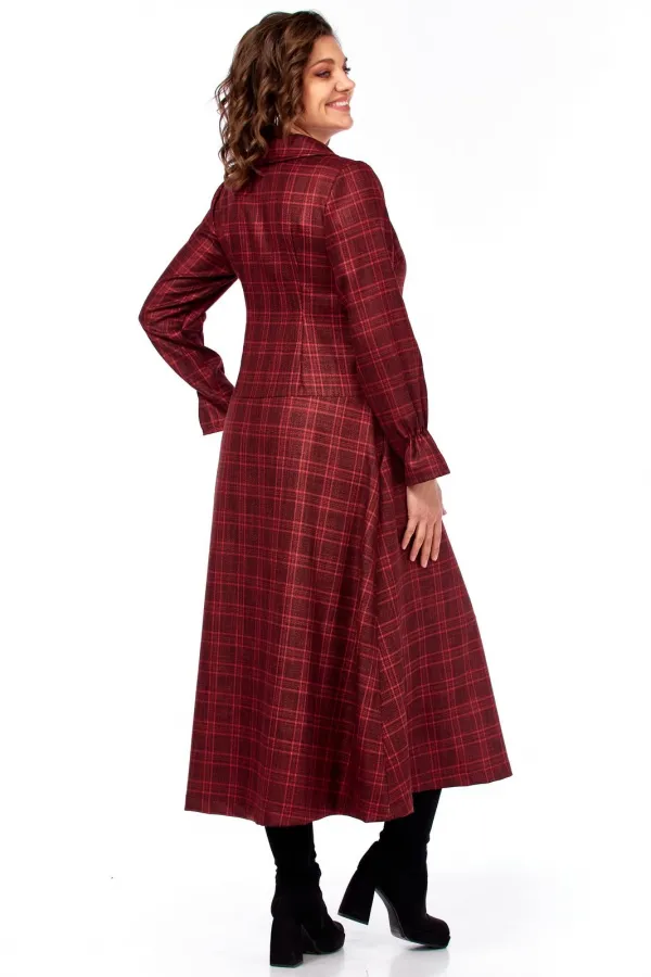 Платье миди, силуэт полуприлегающий в верхней части, переходящий в расклешенный А-силуэт к низу, создающий эффект удлиненной и струящейся фигуры. Воротник широкий, плоский, отложной, с закругленными краями. Лиф с застежкой на петли пуговицы. Декоративный ряд контрастных пуговиц, подчеркивает V-образный вырез и утончает силуэт. Для лучшего прилегания в платье выполнены нагрудные выточки и выточки по спинке, для большего удобства обработаны карманы-хулиганы. Рукава длинные, втачные, с легкой сборкой на манжетах, что добавляет мягкости и женственности. По полочке и спинке идет подрез чуть ниже линии талии, от которого по полочке юбки выполнена встречная складка. Длина изделия по спинке 120 см., длина рукава 62 см.