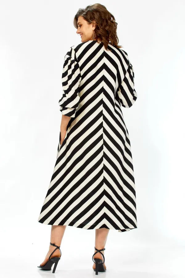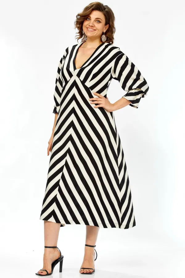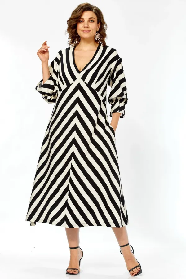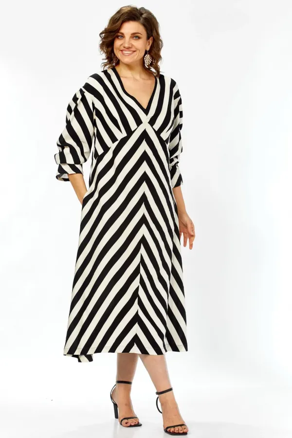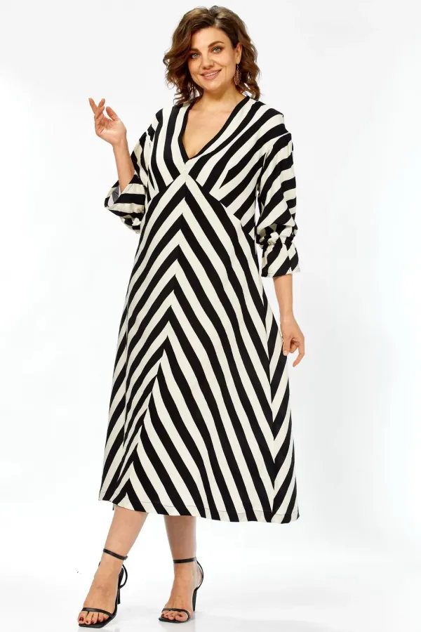 Главная изюминка модели — контрастный черно-молочный принт в широкую полоску. Уникальность ему придают особым образом расположенные полосы: на лифе они идут по диагонали, а на юбке — вертикально, сходясь по центру передней полочки (полоска не совмещается). Такое расположение полос придает платью графичность и визуально вытягивает силуэт.