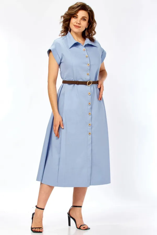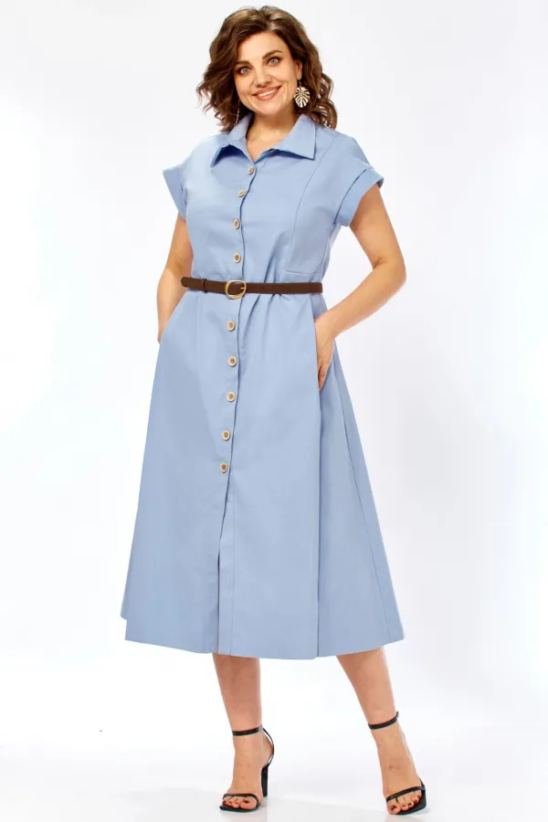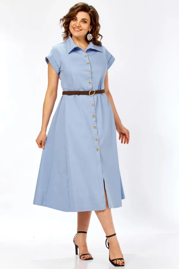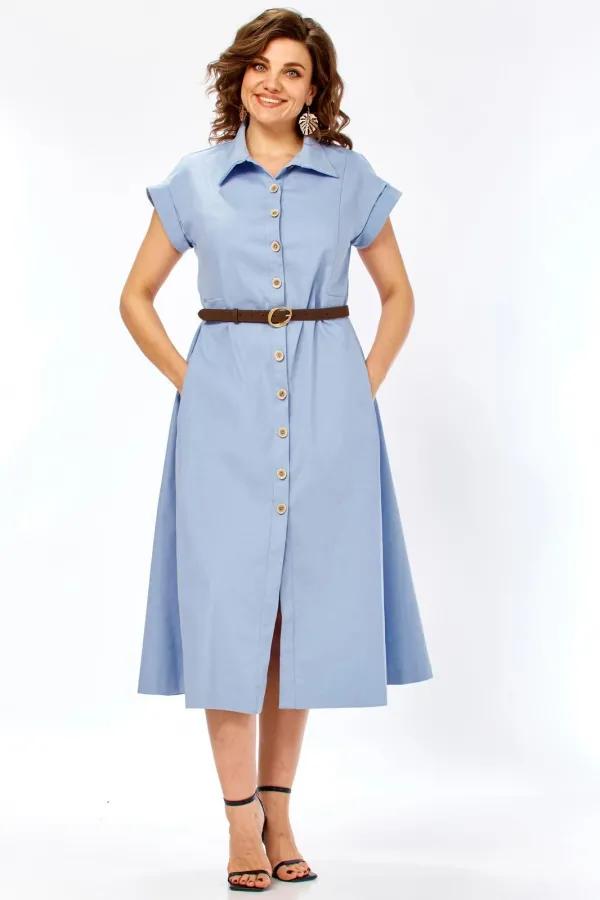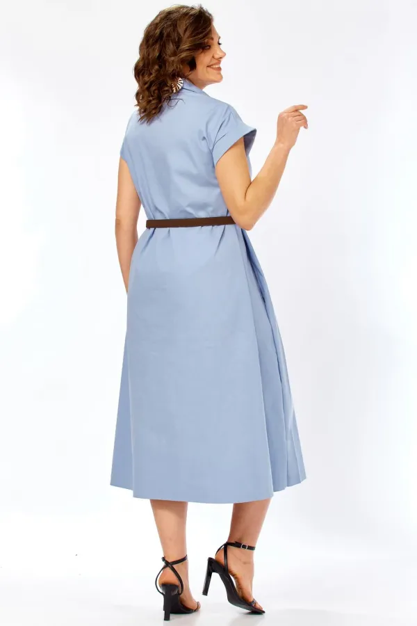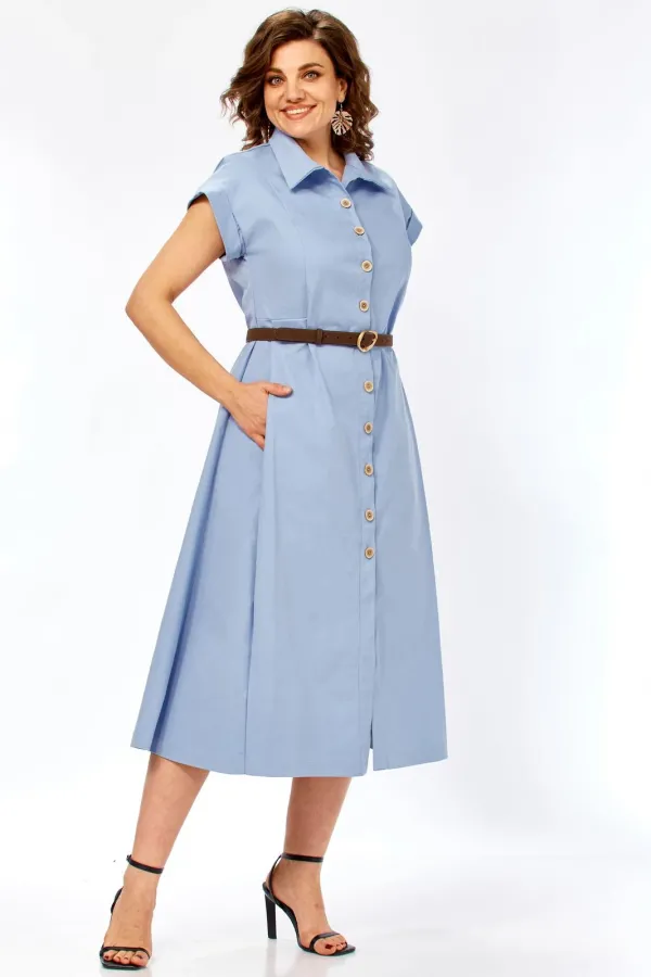 Глубокие встречные складки по бокам — главный конструктивный акцент. Они обеспечивают свободу движения и придают юбке красивый «летящий» эффект. Классический рубашечный воротник подчеркивает лаконичность модели. Застежка на декоративных пуговицах с эффектом дерева, визуально вытягивая силуэт. Короткие цельнокроеные рукава с аккуратными манжетами придают образу современный и расслабленный вид. Удобные боковые карманы искусно спрятаны в швах, не нарушая графичность линий.