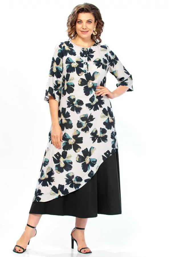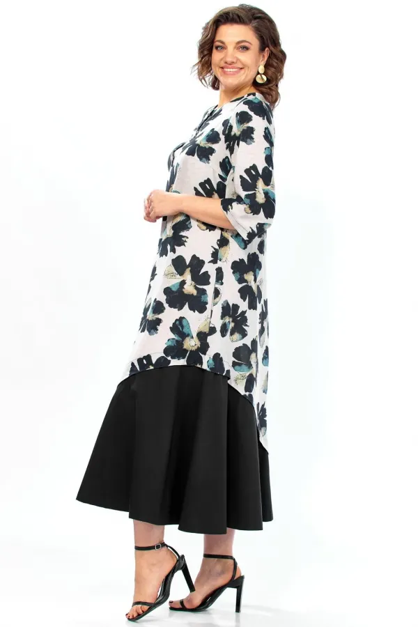 Модель состоит из двух визуальных слоев. Верхний слой — это асимметричная туника с выразительным цветочным принтом, а нижний —однотонная юбка черного цвета.