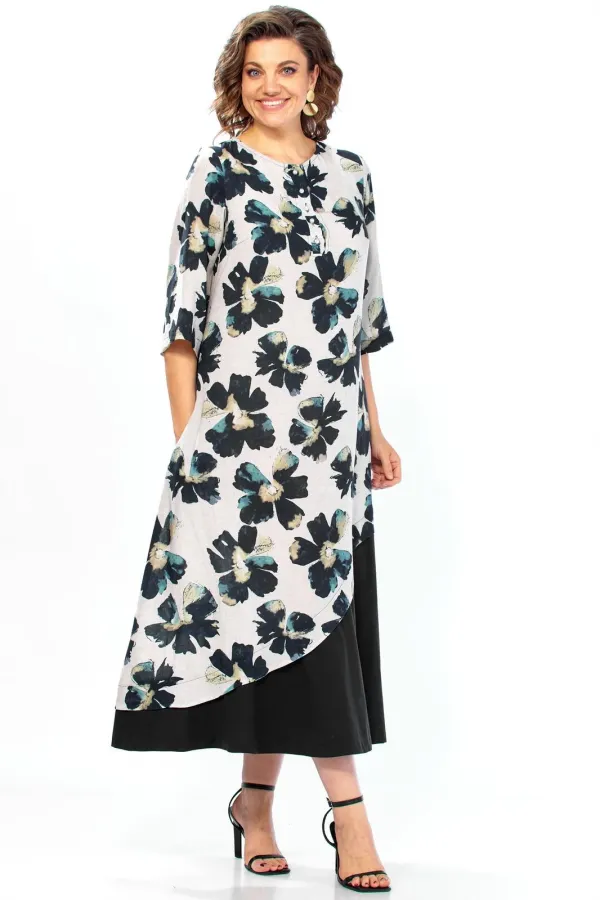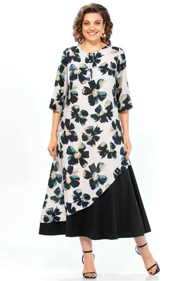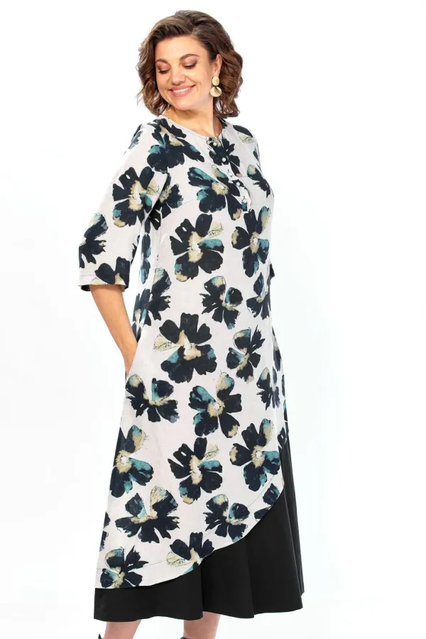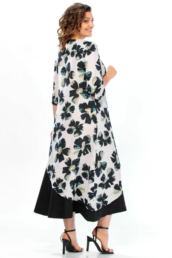 Платье представляет собой стильную и сложную модель с эффектом многослойности, которая сочетает в себе романтичный цветочный принт и строгий минимализм.