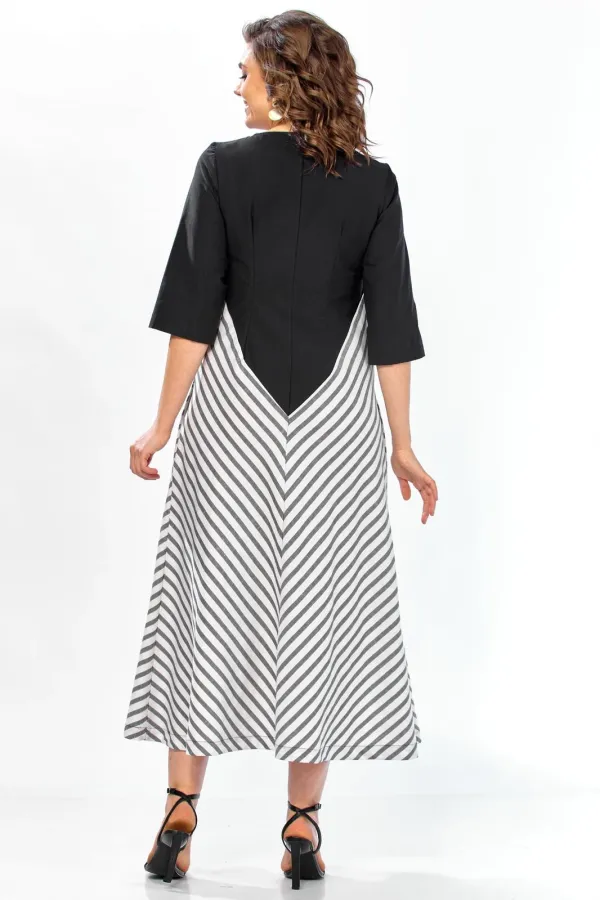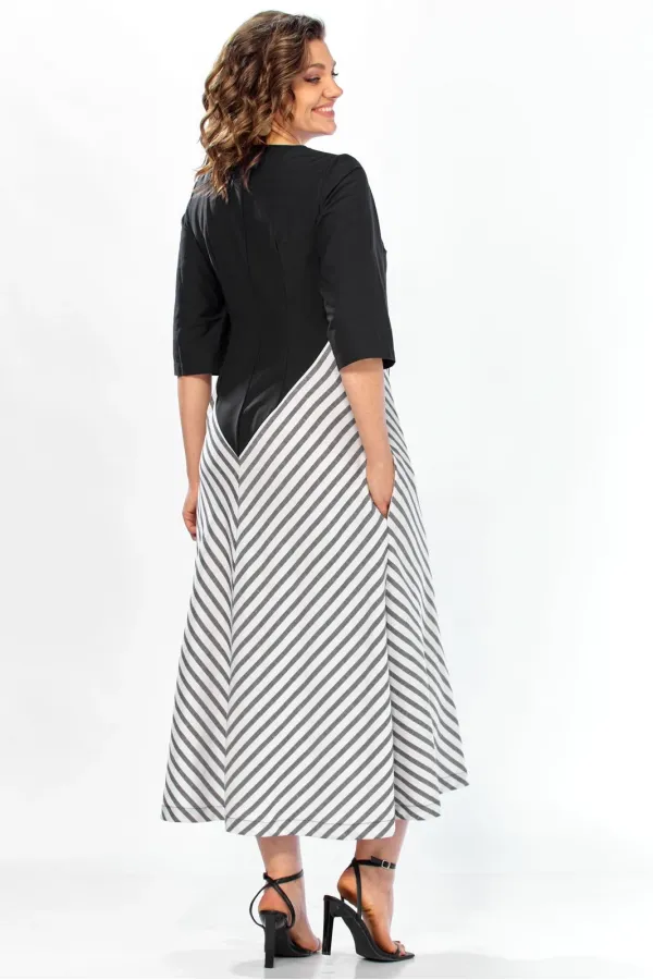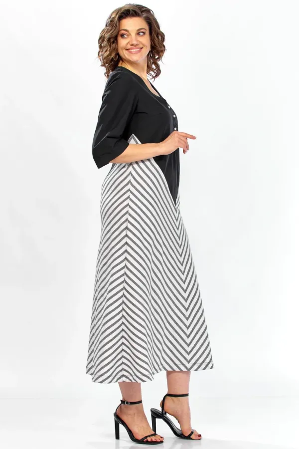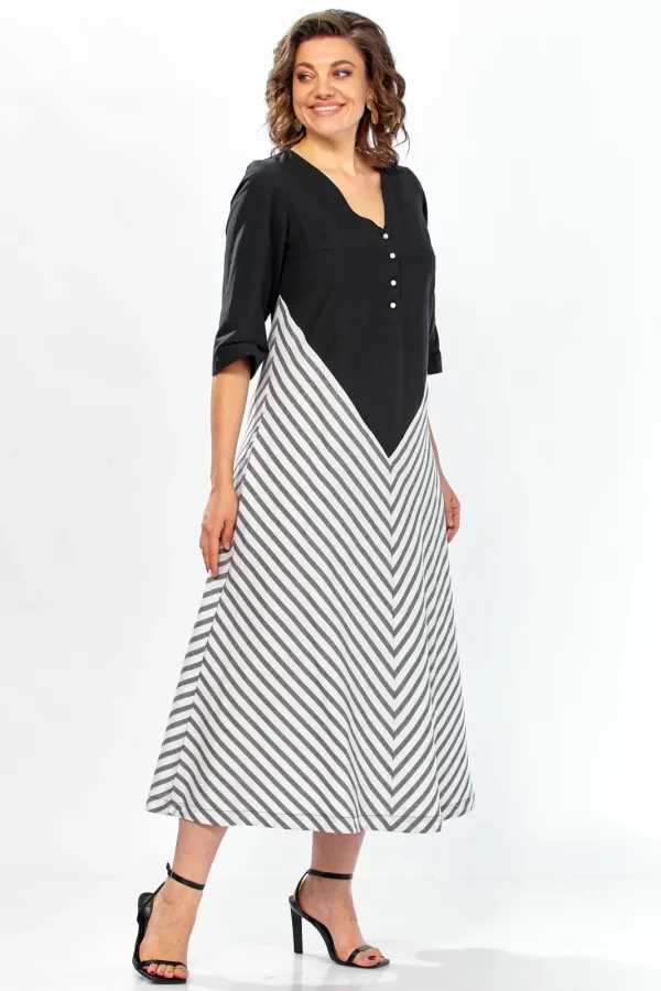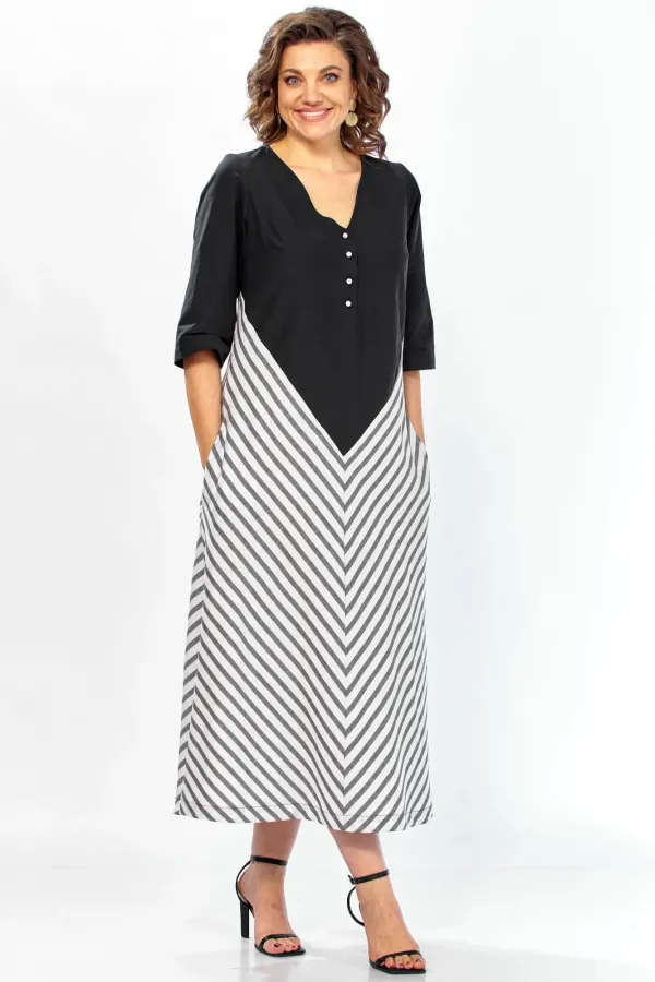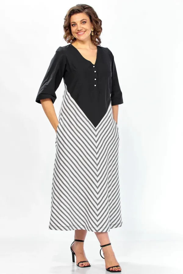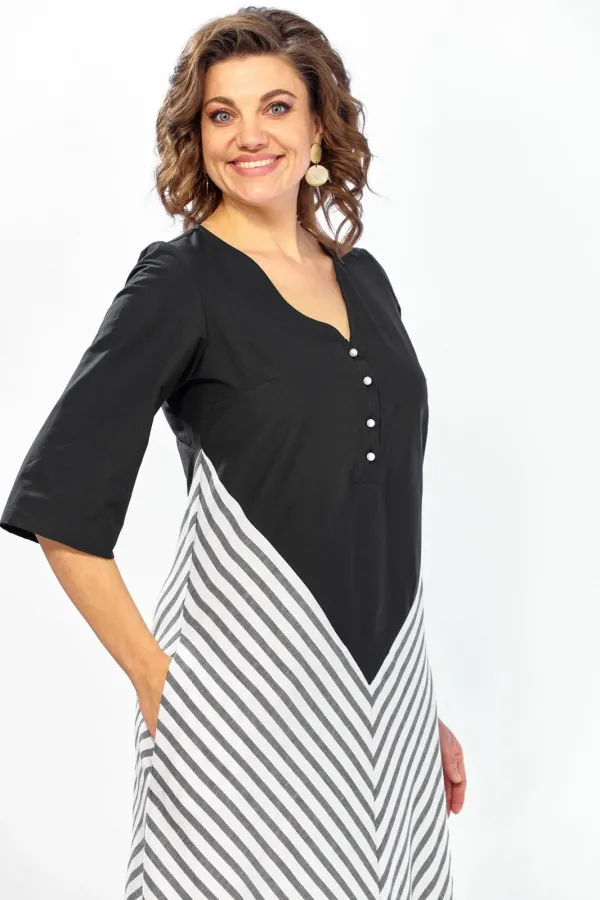 Верх платья выполнен в глубоком черном цвете, аккуратный V-образный вырез переходит в декоративную планку с четырьмя контрастными жемчужными пуговицами. Юбка платья украшена динамичной диагональной полоской в серо-белых тонах. По центру полоски сходятся «углом», создавая интересный оптический узор. Универсальная длина рукава 3/4 открывает запястья, делая образ более легким и женственным. Платье имеет свободный трапециевидный крой, который не стесняет движений. В боковых швах расположены глубокие функциональные карманы, что делает модель практичной для повседневной носки. Благодаря своему крою, модель идеально садится на любую фигуру, деликатно скрывая объем в области бедер и подчеркивая достоинства верхней части силуэта.