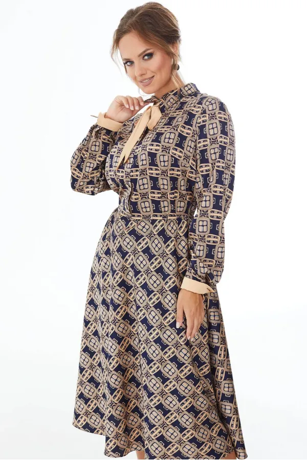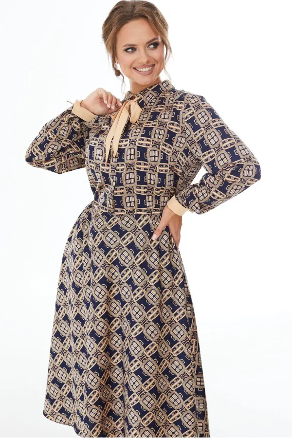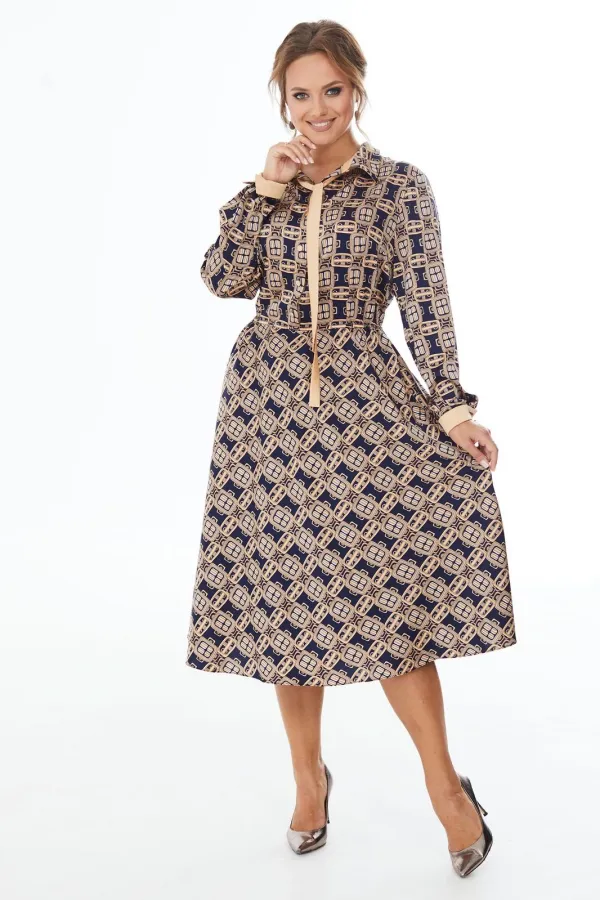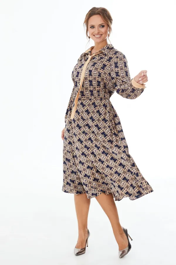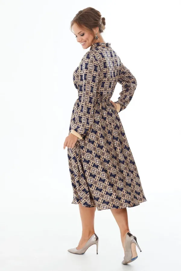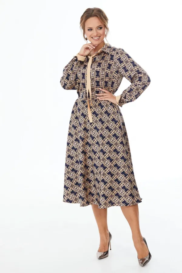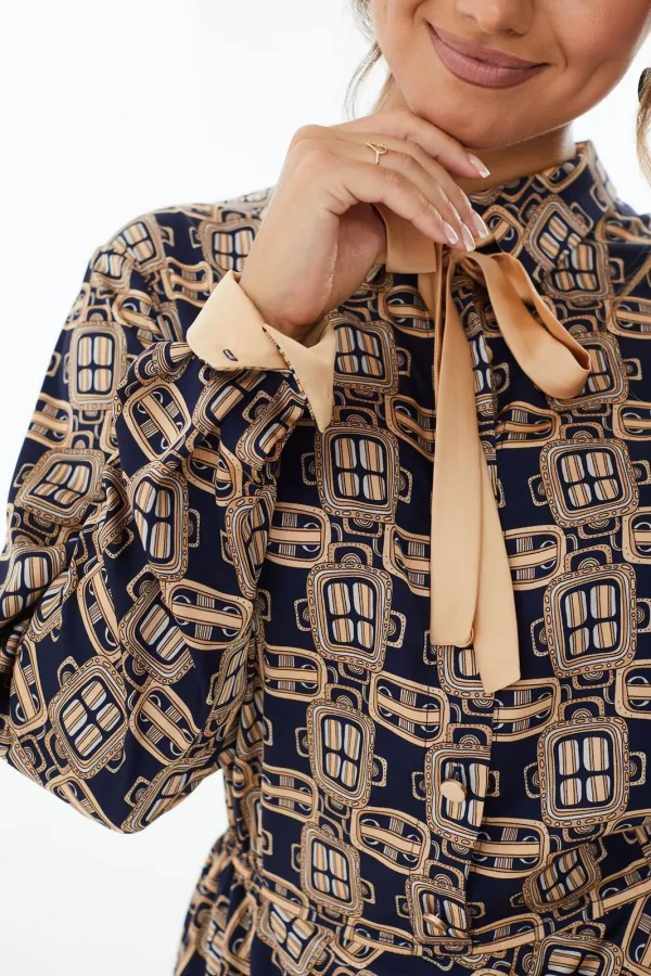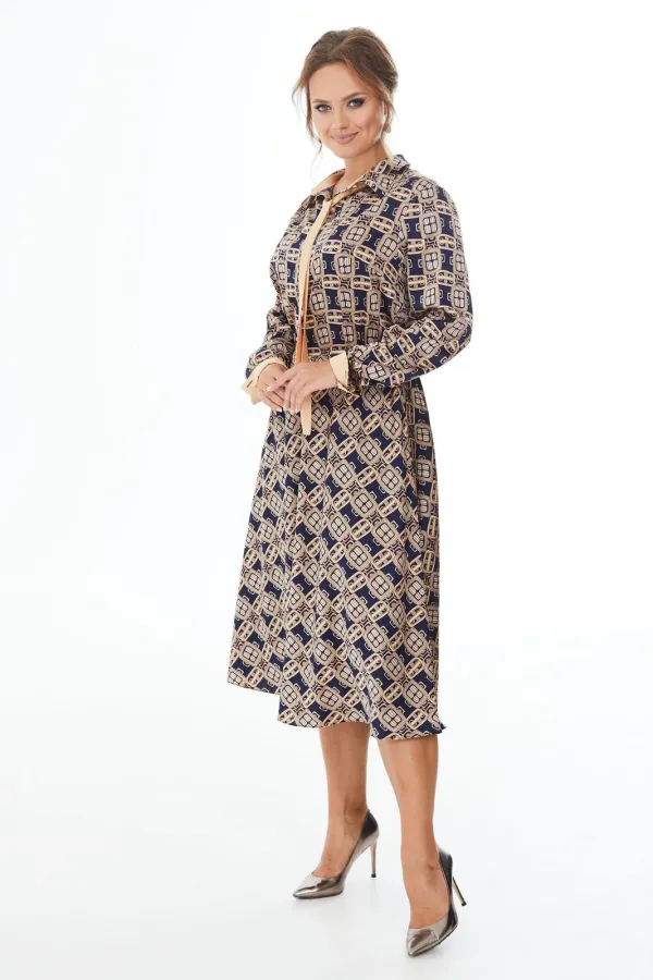Платье прилегающего силуэта длины миди из шелковой ткани с геометрическим рисунком. Резинка на талии. Отложной воротник на стойке, планка до линии талии, застегивающаяся на петли-пуговицы. Рукав длинный с манжетами. Отделочные элементы окантовка контрастной лентой придают платью привлекательность и оригинальность.