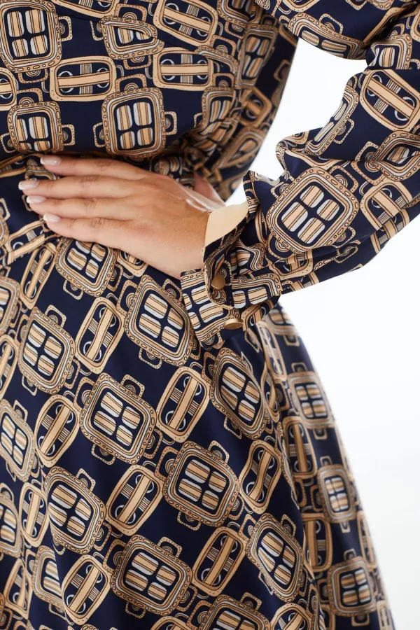 Платье прилегающего силуэта длины миди из шелковой ткани с геометрическим рисунком. Резинка на талии. Отложной воротник на стойке, планка до линии талии, застегивающаяся на петли-пуговицы. Рукав длинный с манжетами. Отде... Читать далее...