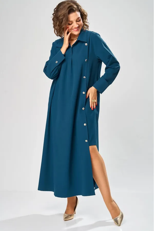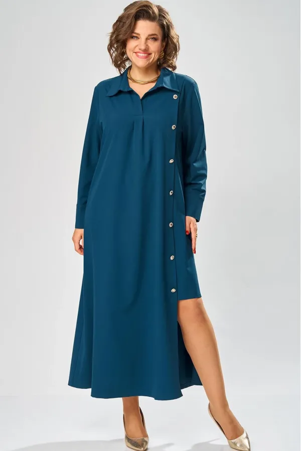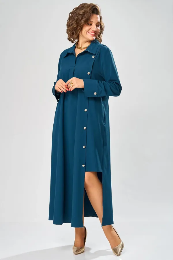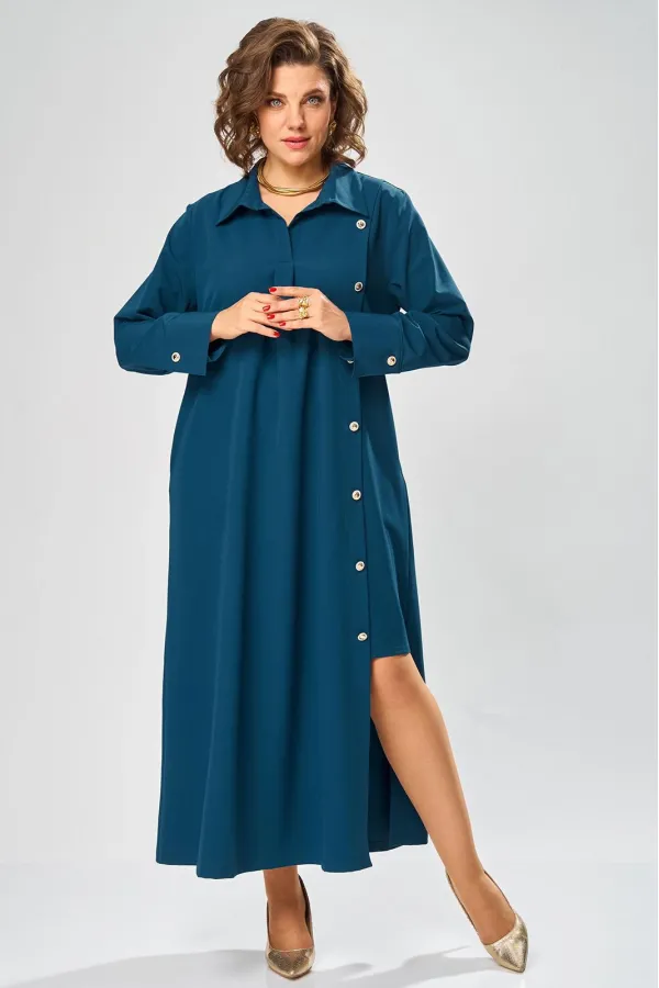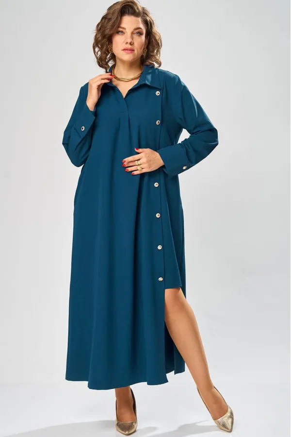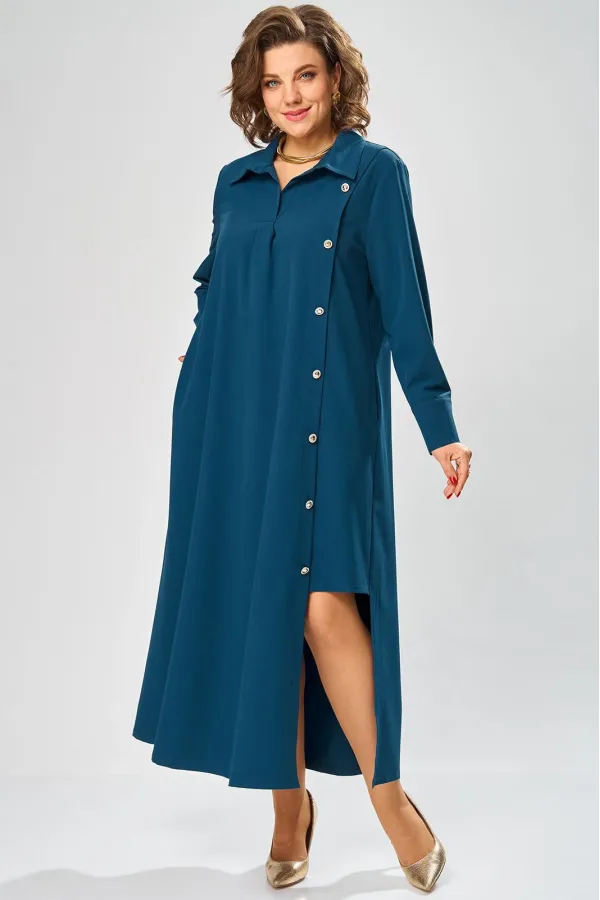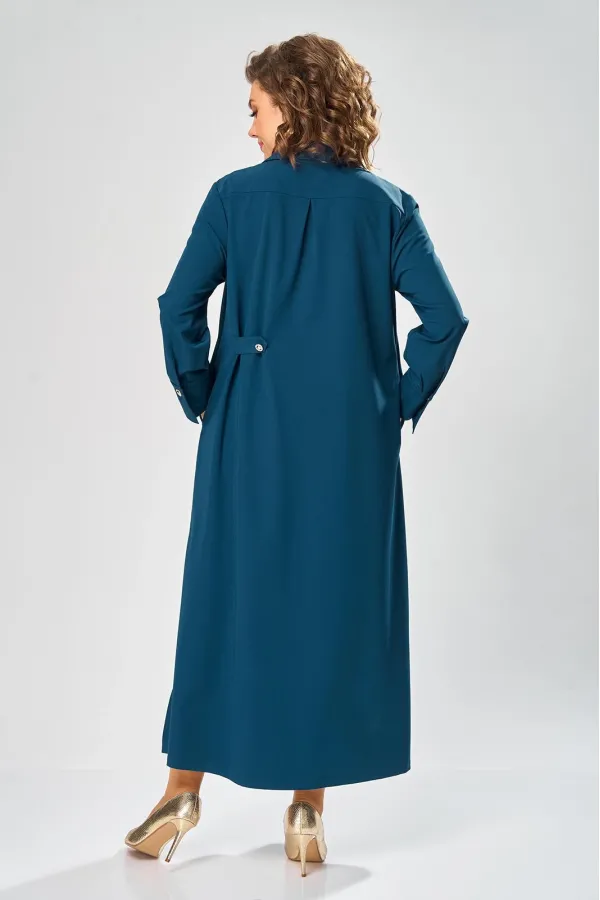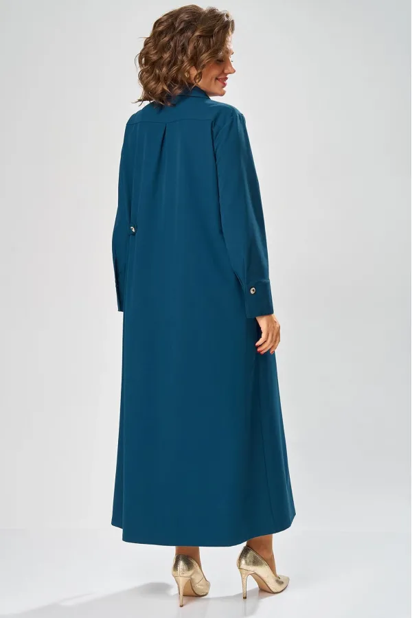 Платье умеренного «А» силуэта, свободный крой, что позволяет рекомендовать их женщинам с самыми разными типами фигур. Плечо слегка спущенное, рукав рубашечный на пате. По горловине отложной воротник со стойкой. В боковых швах, для удобства, выполнены карманы. Длина макси, идеально подходит для любого типа фигуры и стройнит ее.