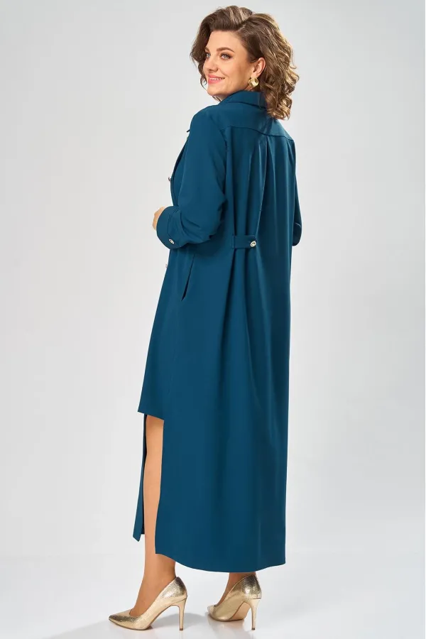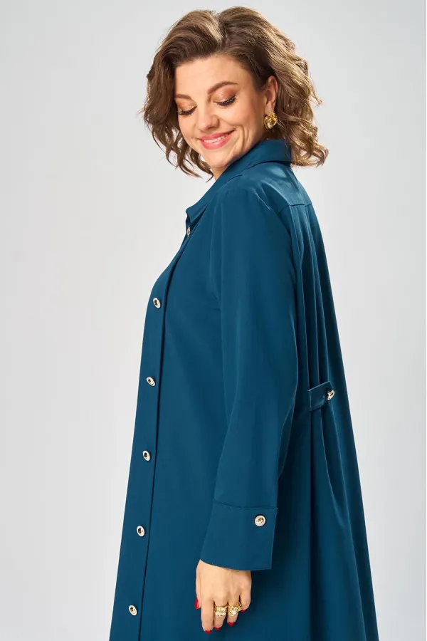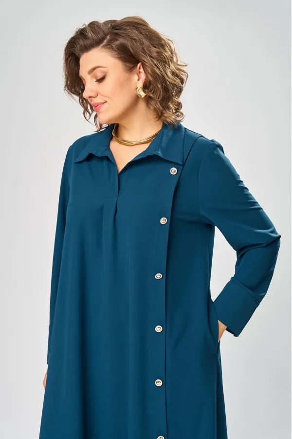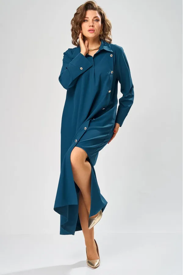 У платья-рубашки узнаваемый фасон: прямой свободный крой. Этот базовый крой дополнен интересными деталями и эффектными декоративными элементами, создавая настоящее произведение модного искусства. Акцент – ассиметричный левый бочок с вертикальной планкой на пуговицы, хлястик по спинке, и немного строгая и слегка дерзкая по переду застежка с воротником.