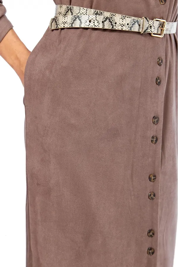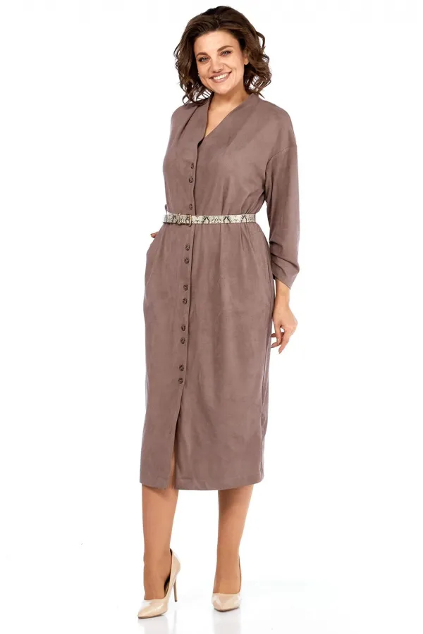 Платье женское поплуприлегающего силуэта с застежкой на петли и пуговицы. Спинка со средним швом. Полочка с мягкой складкой у горловины. Боковые карманы обработаны в швах с частично настроченной мешковиной. Рукав со спушенной линией плеча, втачной, одношовный с 3-мя мягкими складками снизу. Воротник-стойка цельнокройная с полочкой. В комплекте ремень из эко-кожи. Фурнитура может отличаться от заявленной на фото.