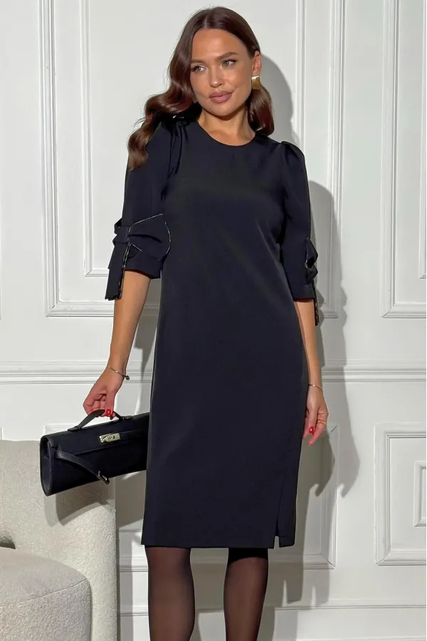 По низу рукава прикреплен отделочный бант, изготовленный из основной и отделочной ткани.Длина платья — 102,1 — 104,9 см