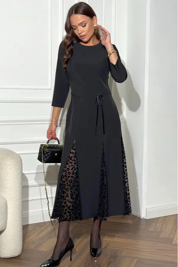 Платье полуприлегающего силуэта, отрезное по линии талии с кулисой, через которую протянут декоративный шнур.