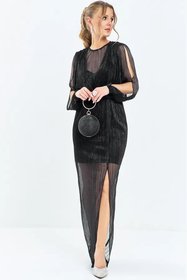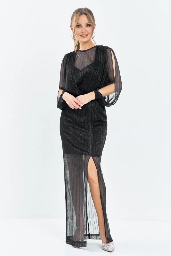 Вечернее женское платье выполнена из эластичной сетки с люрексной нитью, изделие длины - макси, отрезное по линии талии, с регулирующей эластичной тесьмой в таллиевом шве. По лифу в плечевые швы заложены глубокие складки, декольте прикрыто основной тканью. Горловина округлая, рукав - втачной, длинный, разрезной, по низу рукава манжета с петлей-пуговицей. По центру спинки разрез и декоративные складки от плеча. Юбка платья прямая с высоким разрезом от низа выше уровня колена.