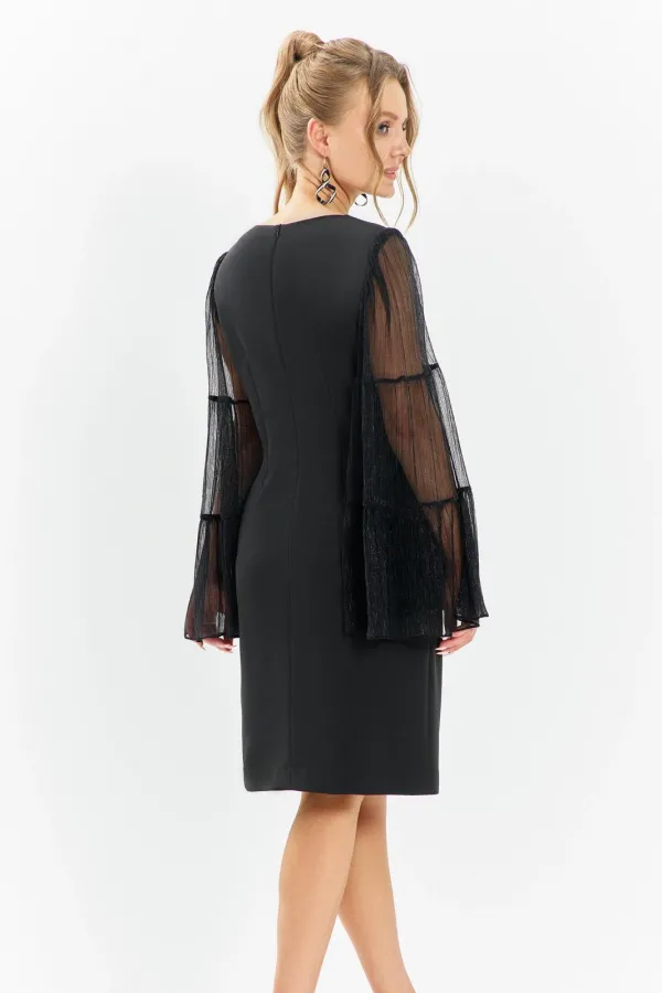 Платье вечернее, коктейльное прямого кроя выполнено из плательной ткани. Горловина округлая, по полочке изделия расположены нагрудные выточки. Рукав втачной длинный расклешенный - воланами. По спинке платья расположен средний шов и таллиевые выточки.