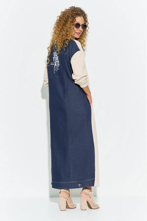 Платье женское длинное в длине (макси) выполнено из сочетания трикотажного полотна по переду и джинса. Полочка с отрезным бочком из джинса, горловина округлая, рукав втачной длинный, приспущенный, низ рукава обработан манжетой. Спинка платья кокеткой и рельефами, на спинке расположена декоративная термопечать. низ изделия по спинке обработан широкой манжетой с патами. (описание ткани: - джинс с небольшой растяжимость без блеска и ворса, есть небольшой рубчик). Бежевый тикотаж (футер) гладкий, без блеска, без рубчика, хорошо тянется).Модель подходит на рост 164-170.