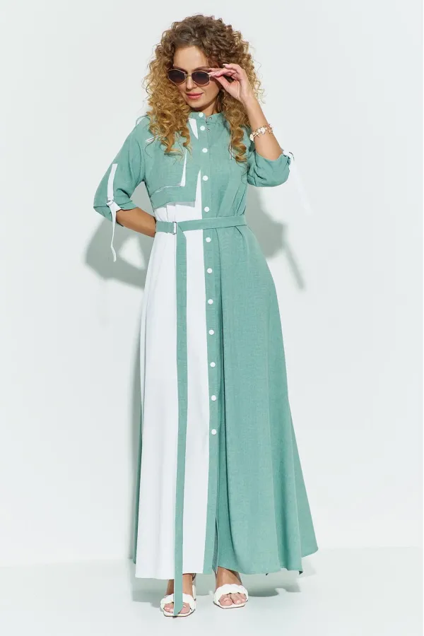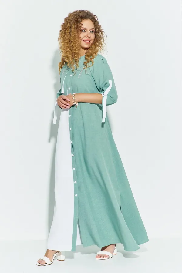 Платье женское свободного кроя выполнено из ткани лён-вишер, платье с планкой по переду и застежкой кнопки. На груди расположены накладные декоративные элементы с молниями. Рукав втачной, горловина стойка, по боковым швам от низа разрезы.