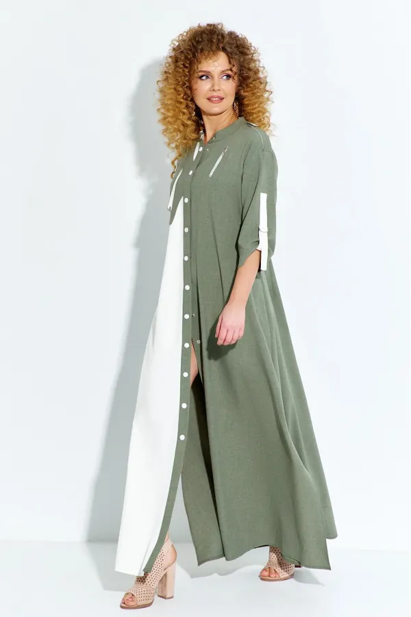 Платье женское свободного кроя выполнено из ткани лён-вишер, платье с планкой по переду и застежкой кнопки. На груди расположены накладные декоративные элементы с молниями. Рукав втачной, горловина стойка, по боковым швам от низа разрезы.