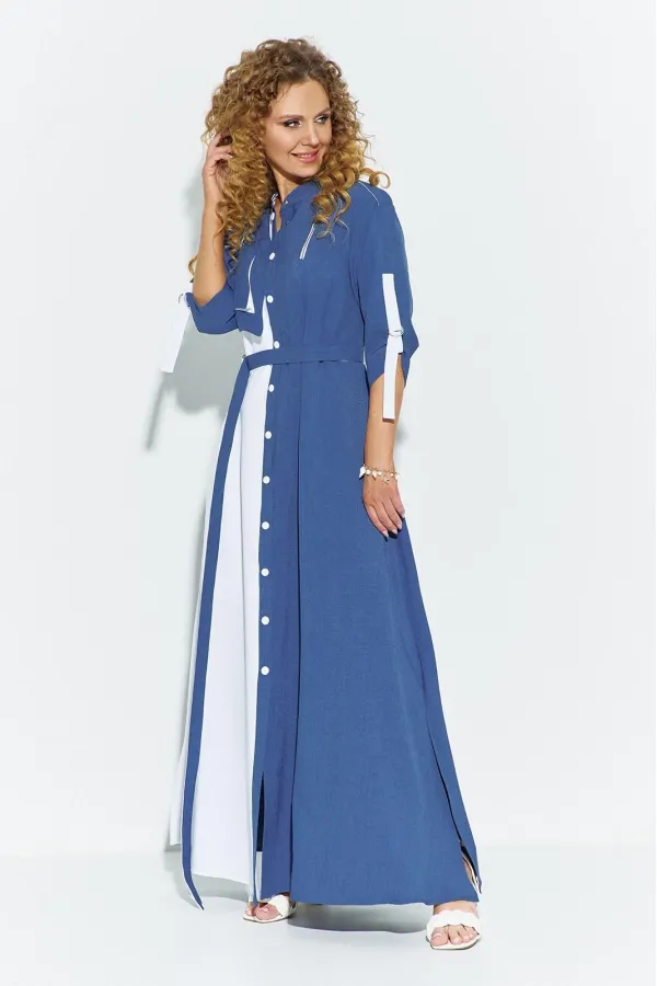 Платье женское свободного кроя выполнено из ткани лён-вишер, платье с планкой по переду и застежкой кнопки. На груди расположены накладные декоративные элементы с молниями. Рукав втачной, горловина стойка, по боковым швам от низа разрезы.