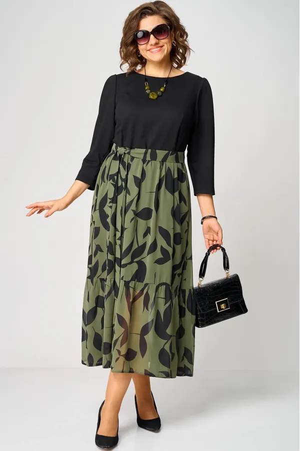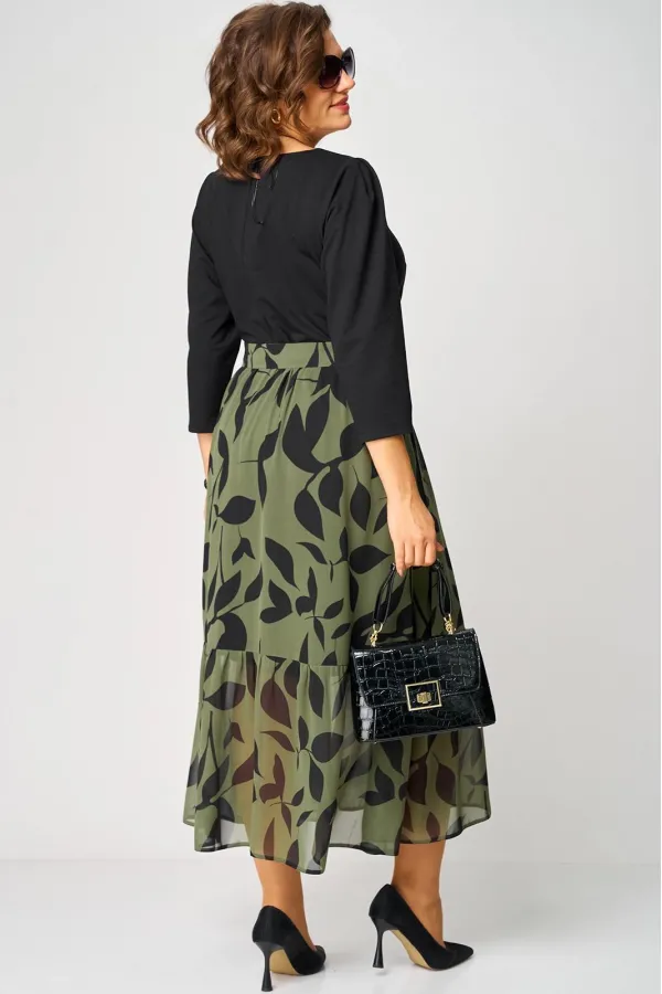 Платье женское нарядно-повседневное полуприлегающего силуэта до талии. Выполнено из трикотажного полотна в сочетании с шифоном. Вырез горловины круглый на обтачке. По спинке застежка капелька на навесную петлю и пуговицу. Рукав втачной 7/8 по верху со встречной складкой. Платье отрезное по талии, верх из трикотажного полотна , низ платья юбка со сборкой. декором платья служит съемный пояс в цвет юбки.