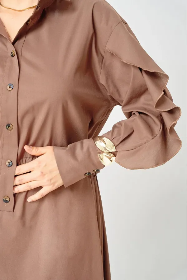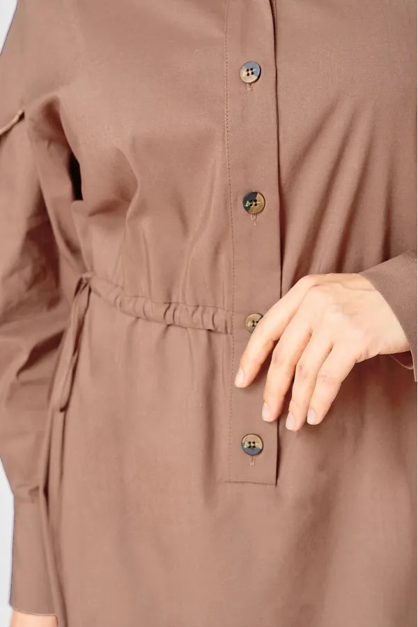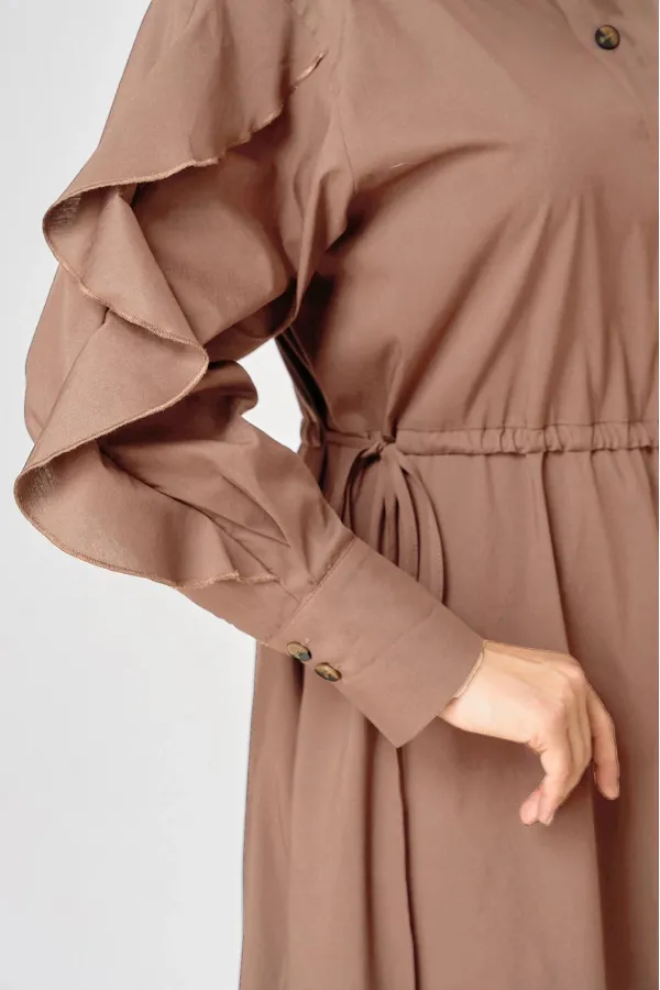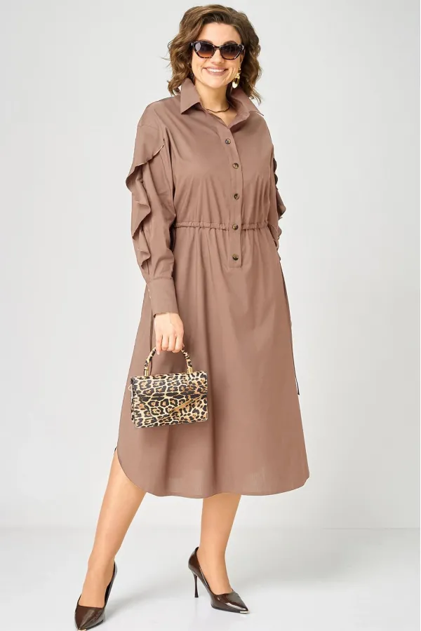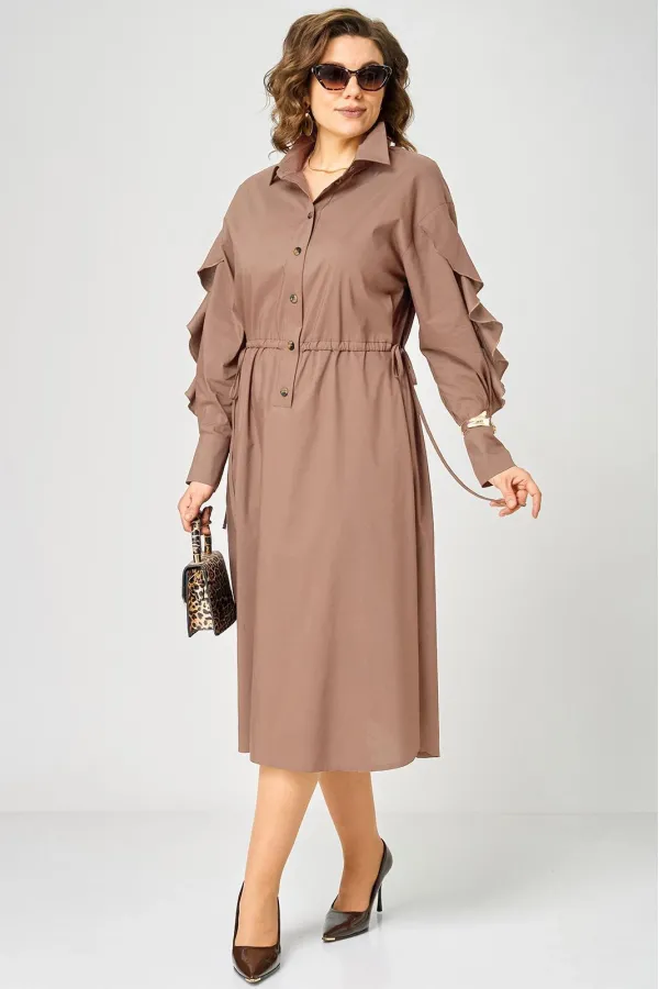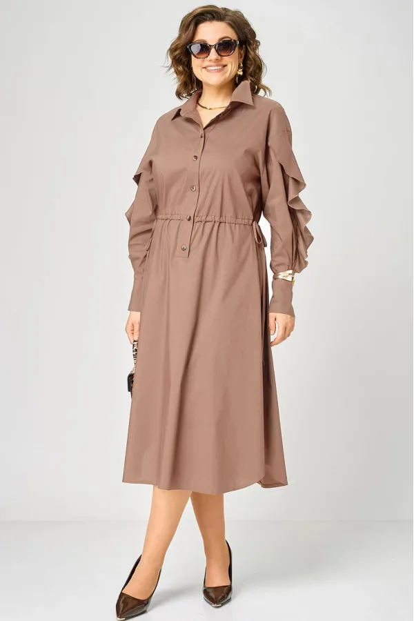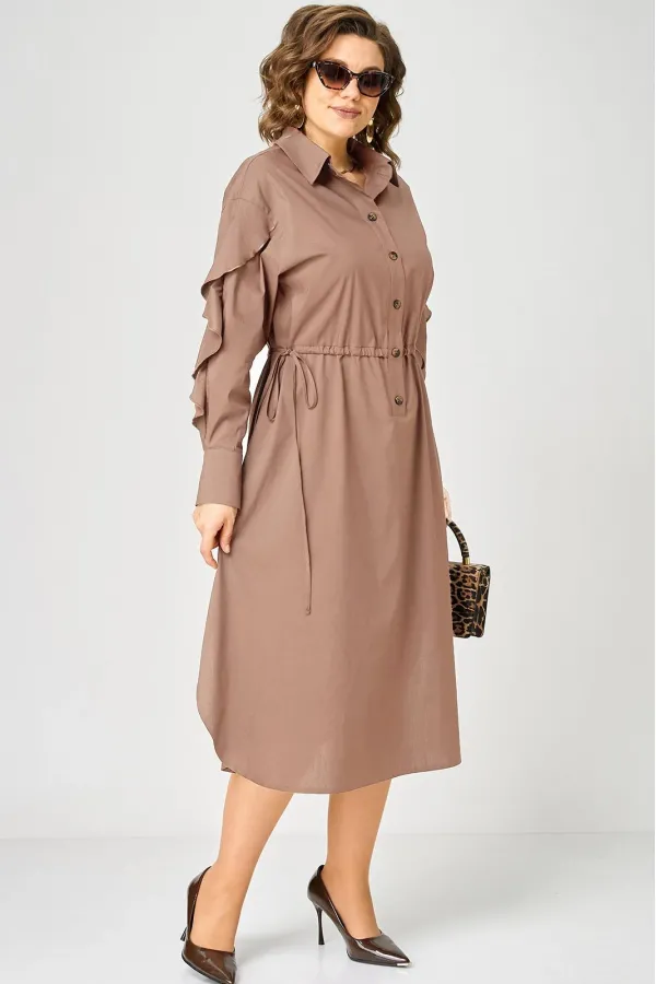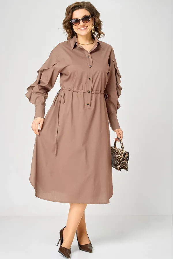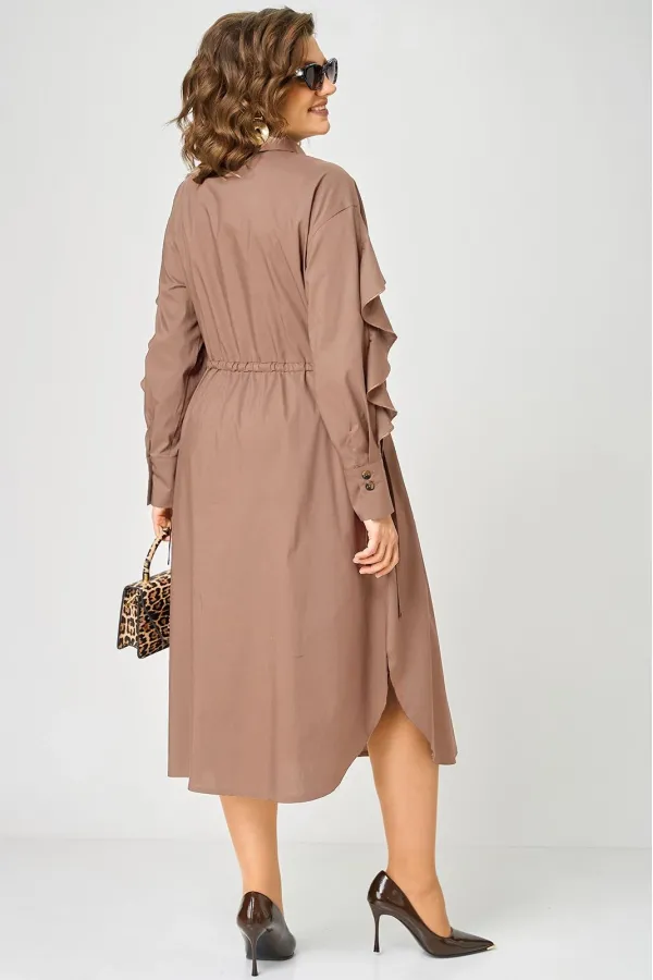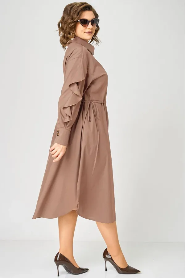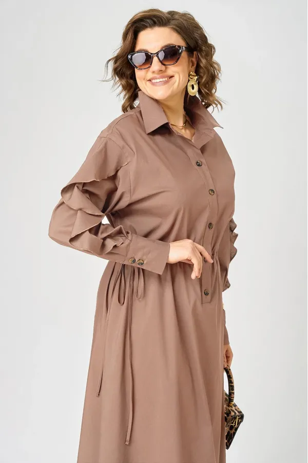 Платье женское полуприлегающего силуэта до пояса в стиле платья-рубашки, выполнено из однотонного хлопка. Трендовый фасон, который сочетает в себе коморт повседневной вещи и элегантность праздника. Вырез горловины воротник на стойке рубашечного типа, застежка планка чуть ниже талии на обметаннве петли и пуговицы. Плечо спущенное, рукав втачной по центру разрезной со вставкой в виде волана на притачной манжете, что придает изделию легкость и изюминку. По полочке и спинке кулиса с руликом входящим к боковым швам. Идеальная талия за 1 секунду. Встроенная кулиска с регулировкой - это гениальное решение, которое подстраивается под вашу фигуру и Вы сами создаете свой восхитительный образ и регулируете свои обьемы. Низ платья фигурный закругленный к боковым швам, что создает удобство в носке и небанальность в изделии. В боковых швах обработаны разрезы. Декором платья служат отделочные пуговицы, кулиска и необычные воланы по рукавам.