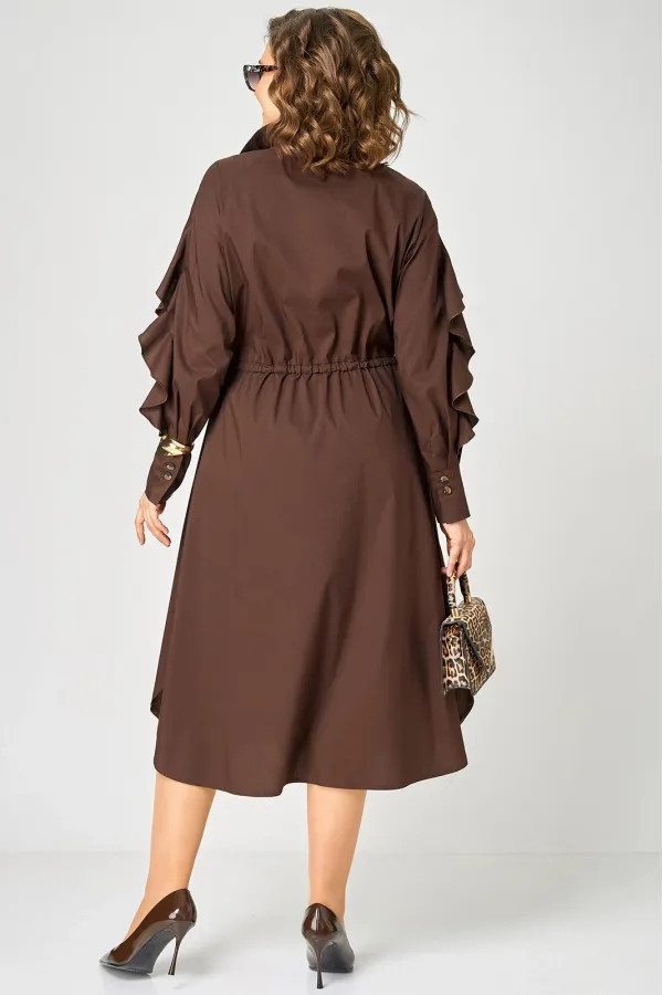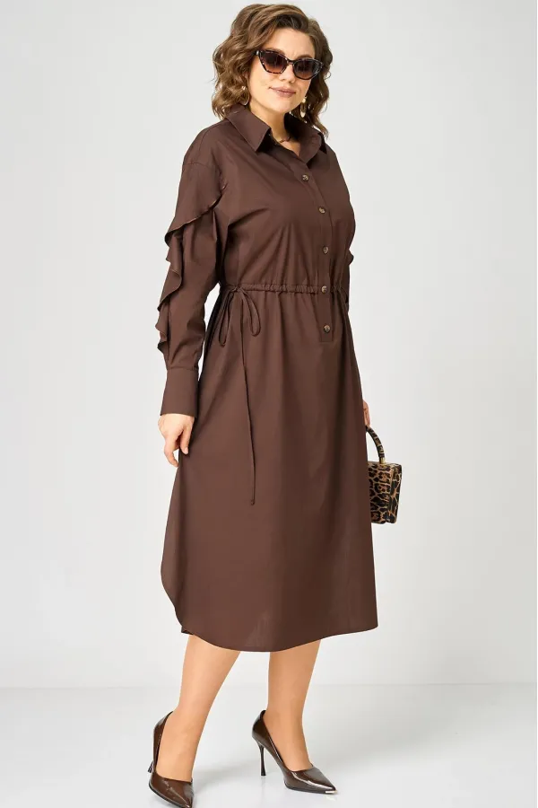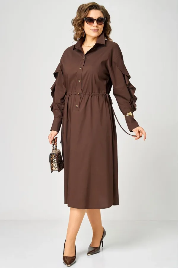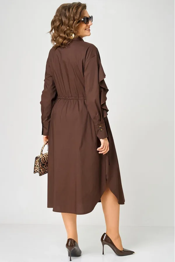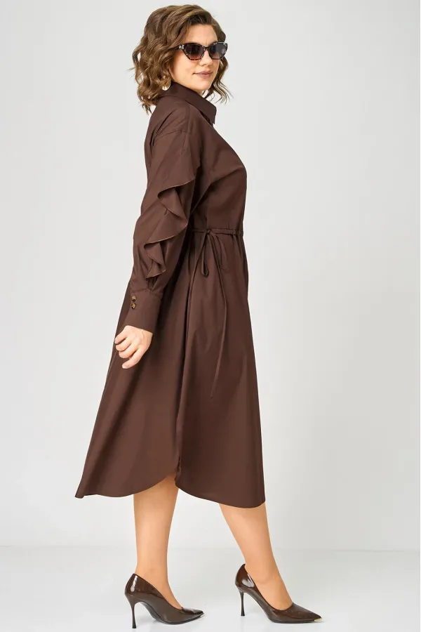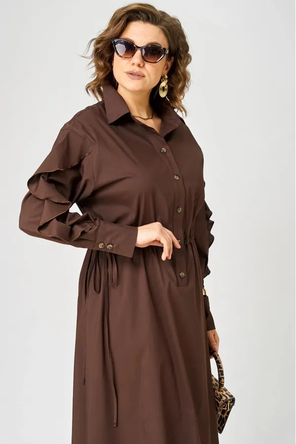 Платье женское полуприлегающего силуэта до пояса в стиле платья-рубашки, выполнено из однотонного хлопка. Трендовый фасон, который сочетает в себе коморт повседневной вещи и элегантность праздника. Вырез горловины воротник на стойке рубашечного типа, застежка планка чуть ниже талии на обметаннве петли и пуговицы. Плечо спущенное, рукав втачной по центру разрезной со вставкой в виде волана на притачной манжете, что придает изделию легкость и изюминку. По полочке и спинке кулиса с руликом входящим к боковым швам. Идеальная талия за 1 секунду. Встроенная кулиска с регулировкой - это гениальное решение, которое подстраивается под вашу фигуру и Вы сами создаете свой восхитительный образ и регулируете свои обьемы. Низ платья фигурный закругленный к боковым швам, что создает удобство в носке и небанальность в изделии. В боковых швах обработаны разрезы. Декором платья служат отделочные пуговицы, кулиска и необычные воланы по рукавам.