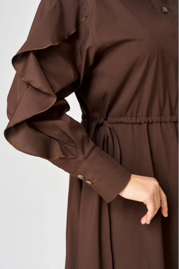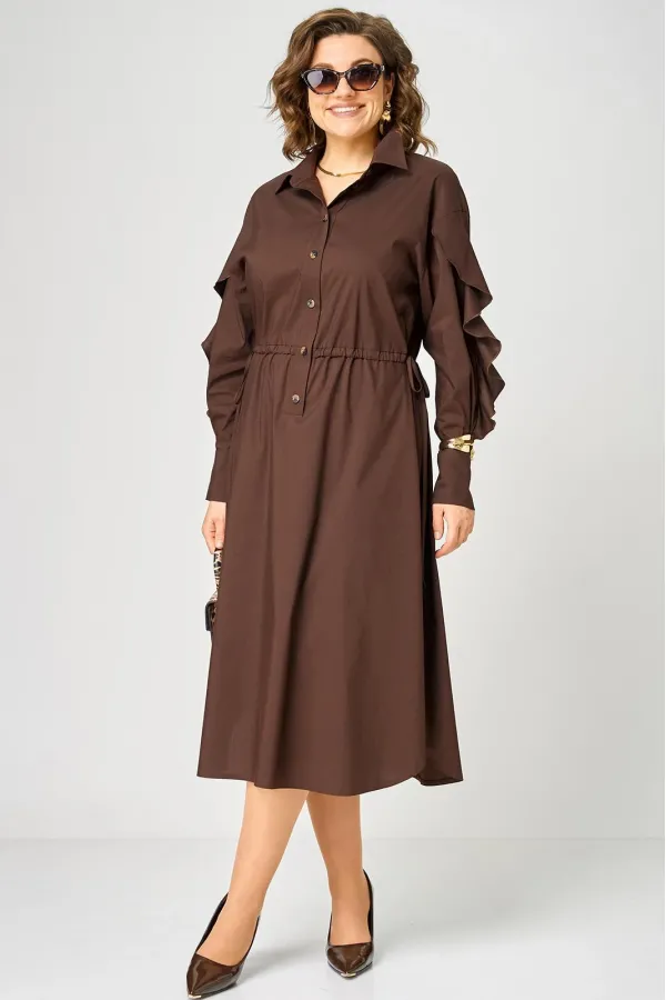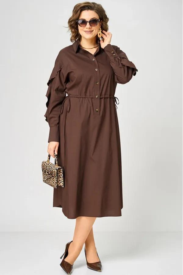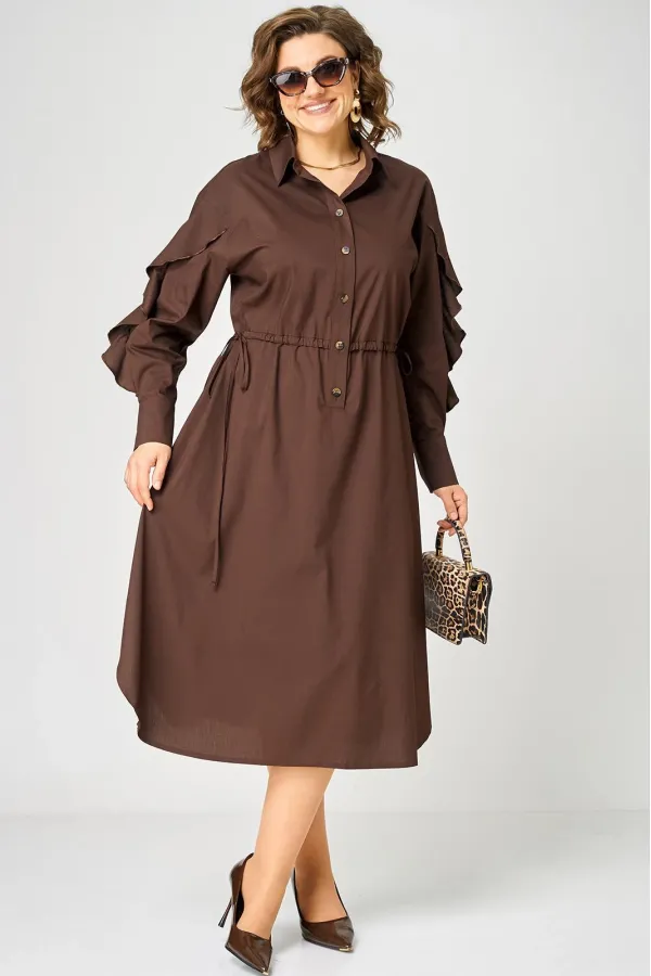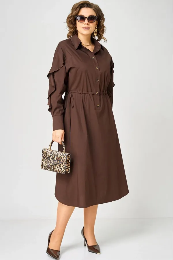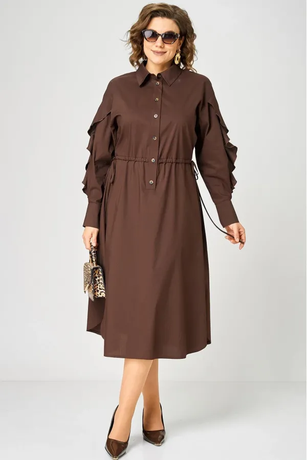 Платье женское полуприлегающего силуэта до пояса в стиле платья-рубашки, выполнено из однотонного хлопка. Трендовый фасон, который сочетает в себе коморт повседневной вещи и элегантность праздника. Вырез горловины воротник на стойке рубашечного типа, застежка планка чуть ниже талии на обметаннве петли и пуговицы. Плечо спущенное, рукав втачной по центру разрезной со вставкой в виде волана на притачной манжете, что придает изделию легкость и изюминку. По полочке и спинке кулиса с руликом входящим к боковым швам. Идеальная талия за 1 секунду. Встроенная кулиска с регулировкой - это гениальное решение, которое подстраивается под вашу фигуру и Вы сами создаете свой восхитительный образ и регулируете свои обьемы. Низ платья фигурный закругленный к боковым швам, что создает удобство в носке и небанальность в изделии. В боковых швах обработаны разрезы. Декором платья служат отделочные пуговицы, кулиска и необычные воланы по рукавам.