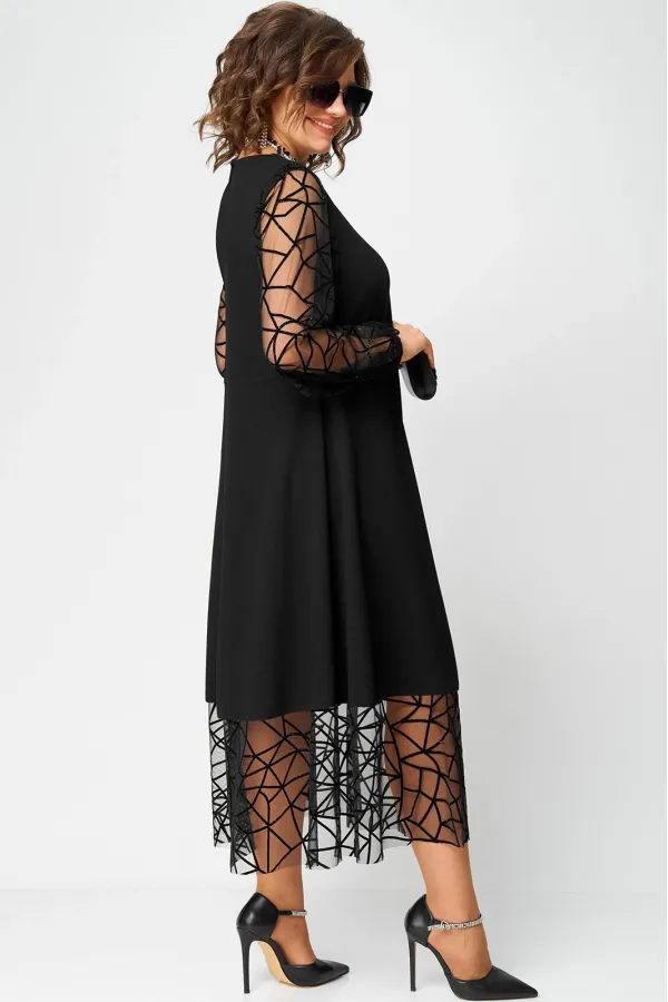 Платье шикарное женское нарядное вечернее полуприлегающего силуэта расширенное к низу, выполнено из плательного крепа в сочетании с сеткой с принтом в виде паутинки. Вырез горловины круглый на обтачке, по пинке застежка на навесную петлю и пуговицу. Рукав втачной из сетки по низ собран на резинку. Платье с фигурным подрезом по полочке, по низу притачной волан из сетки. Декором служит красивая нарядная отделочная ткань на рукавах и волане.