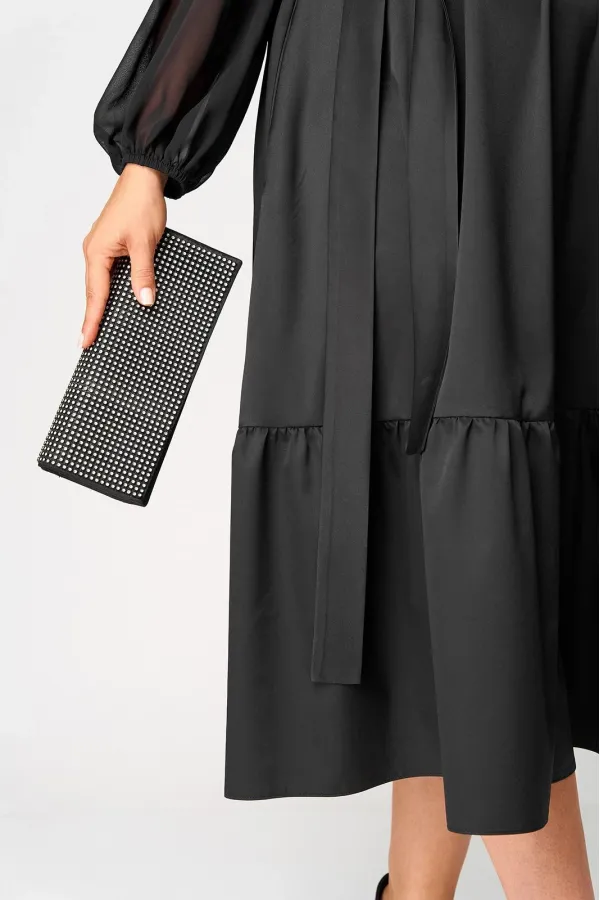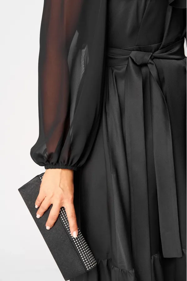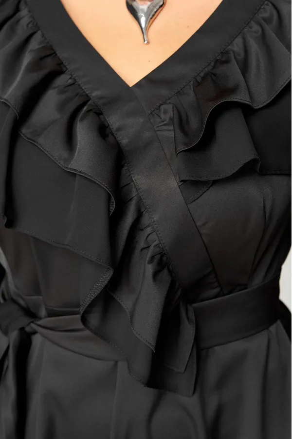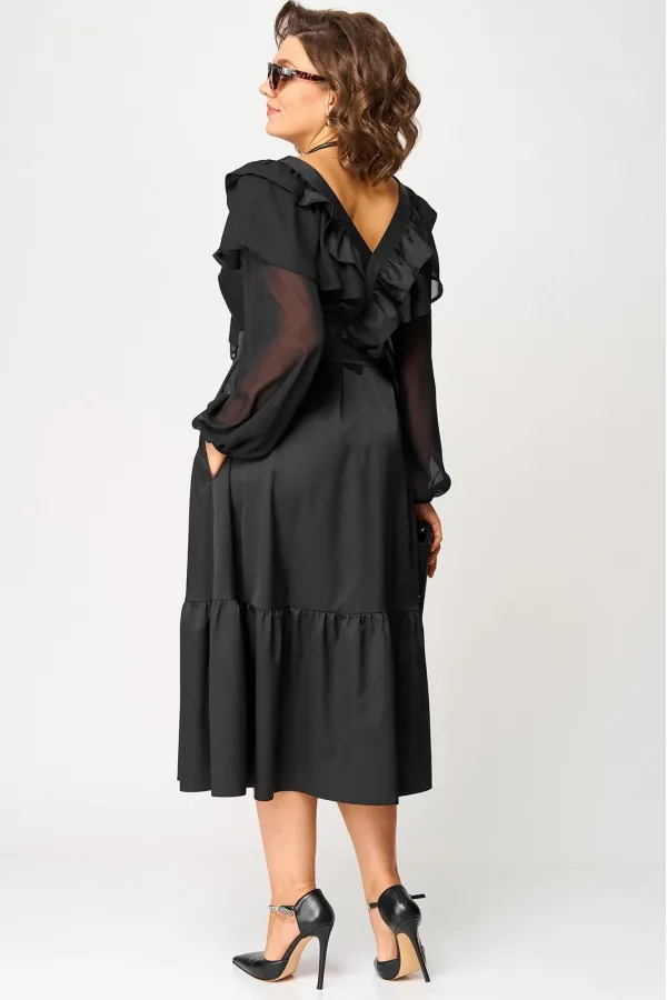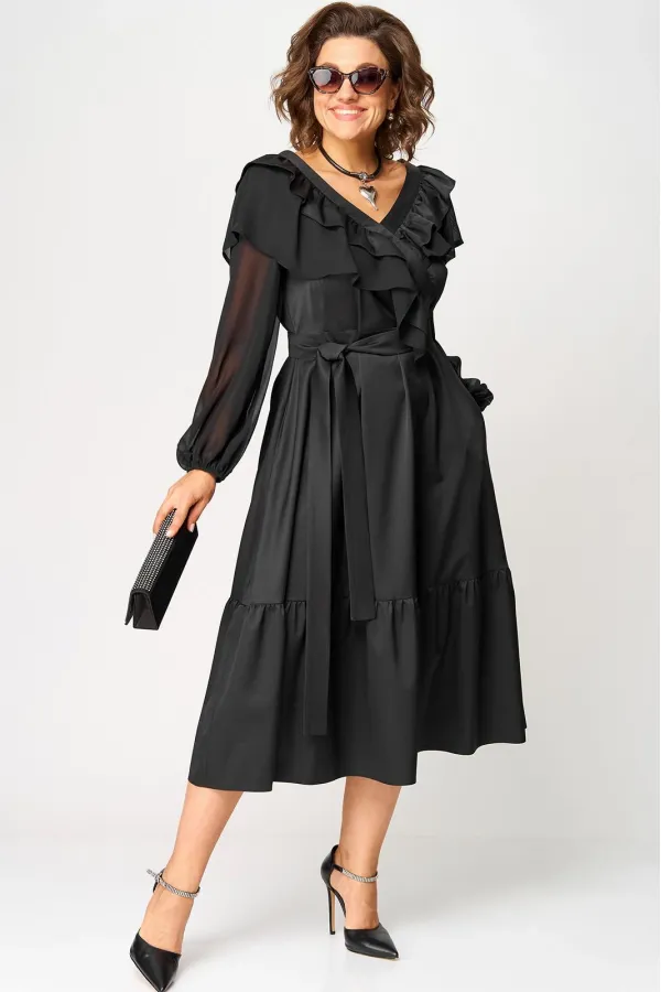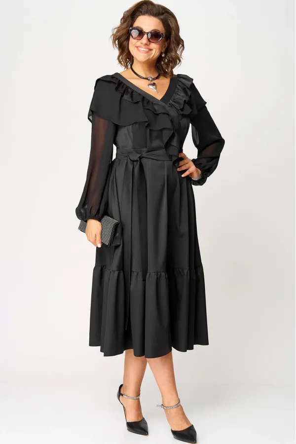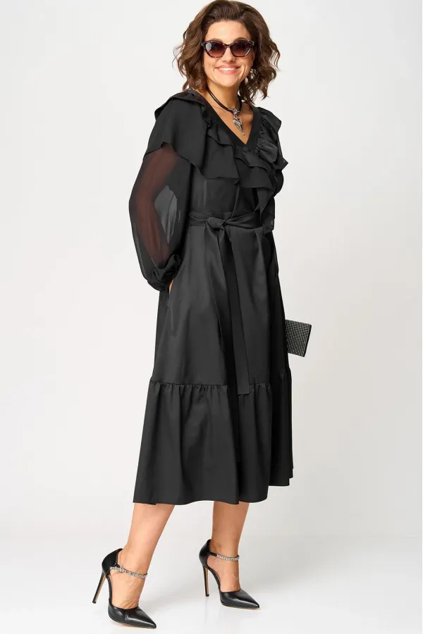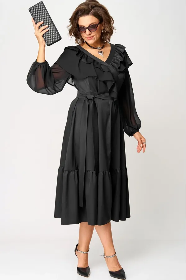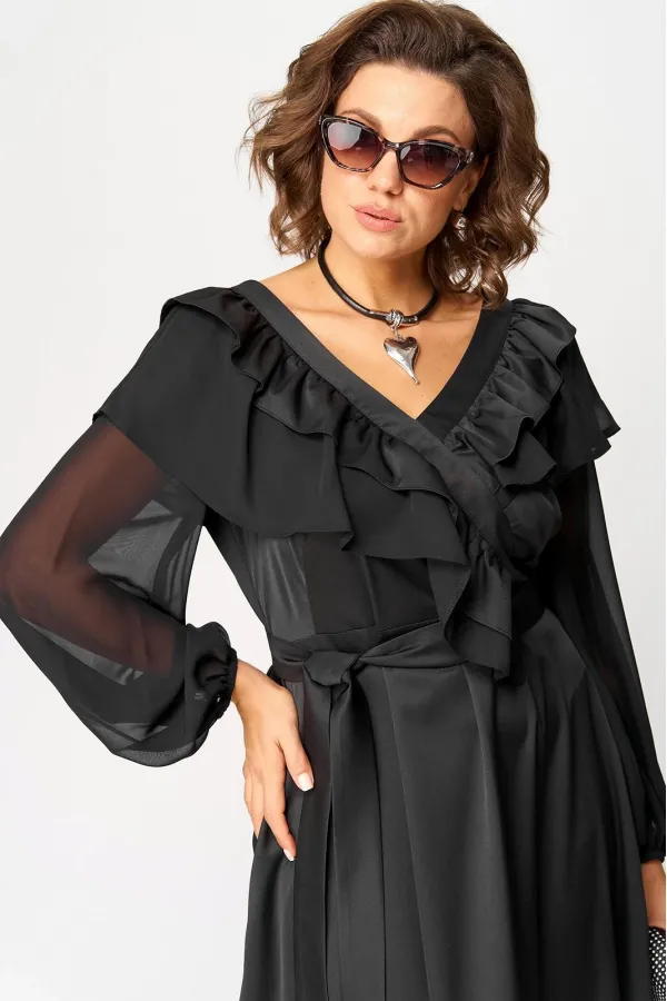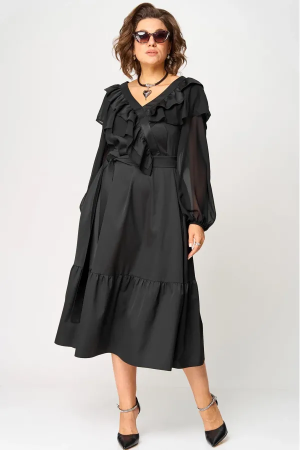 Платье женское нарядно-повседневное полуприлегающего силуэта до талии и расширенное к низу. Платье отрезное по линии талии, вырез горловины V-образный с ассиметричными рюшами из тканей двух дизайнов. Рукав втачной из шифона по низу на резинке. В боковых швах платья обработаны карманы, по низу притачной волан из основной ткани. Декором платья служит съемный пояс из основной ткани.