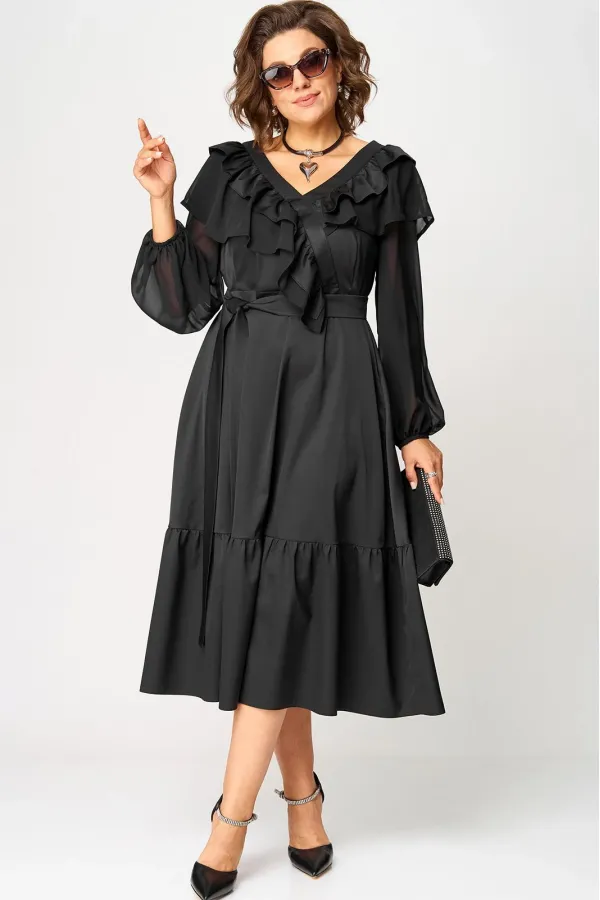 Платье женское нарядно-повседневное полуприлегающего силуэта до талии и расширенное к низу. Платье отрезное по линии талии, вырез горловины V-образный с ассиметричными рюшами из тканей двух дизайнов. Рукав втачной из шиф... Читать далее...