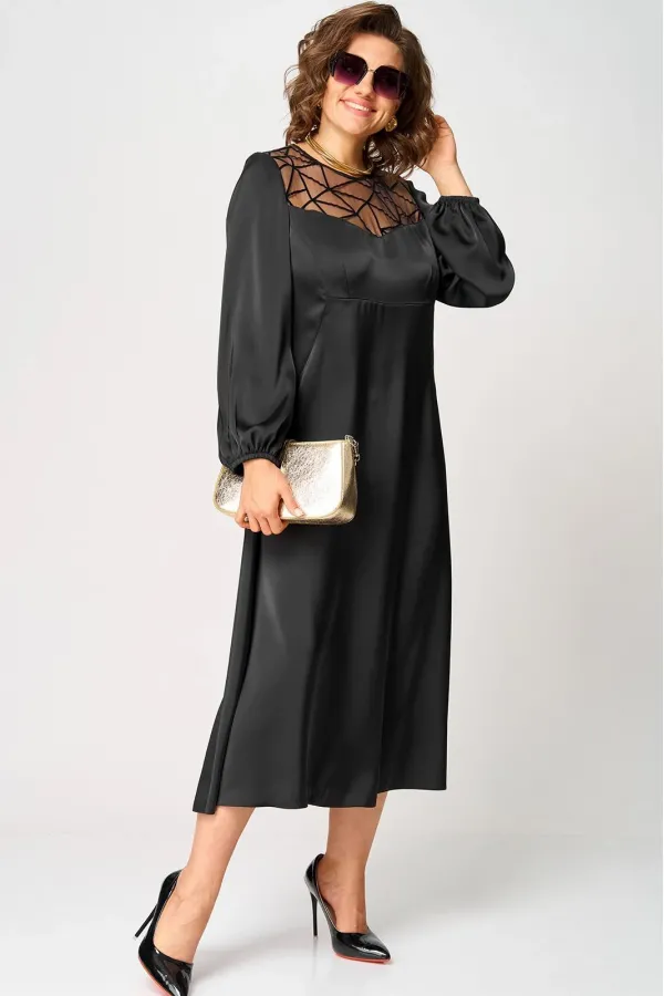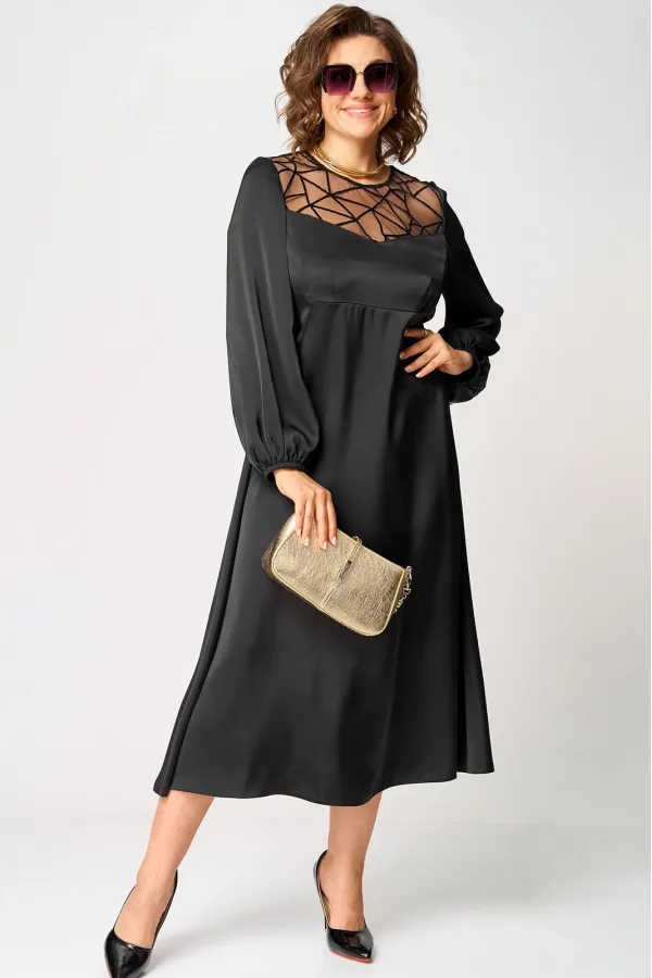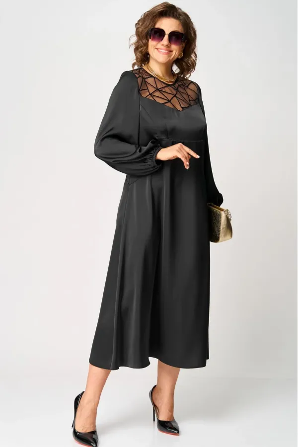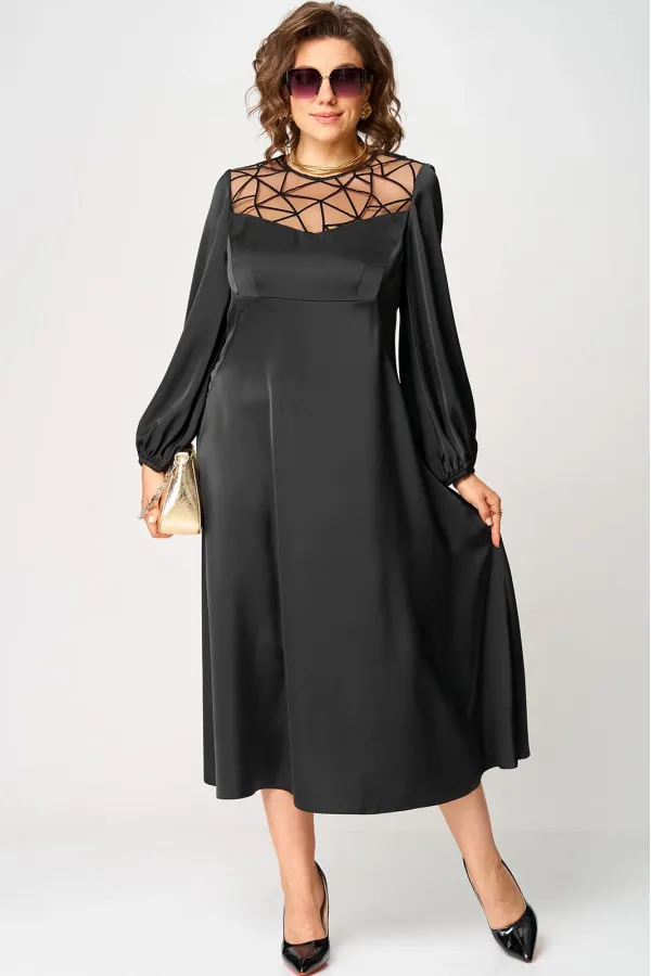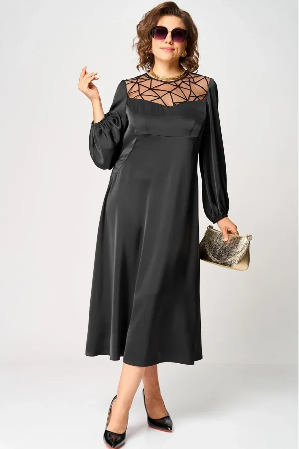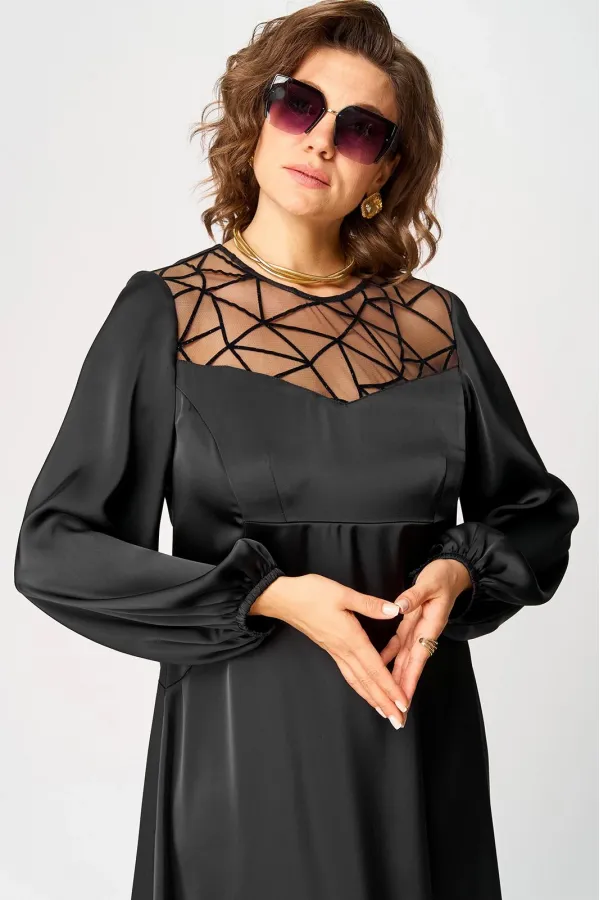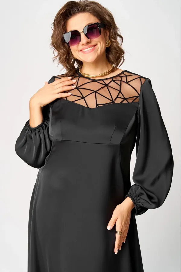 Платье женское нарядное полуприлегающего силуэта расширенное к низу. Выполнено из плательной ткани в сочетании с отделкой. Вырез горловины круглый обработан косой бейкой, рукав втачной по низу собран на притачной резинке. По переду платье отрезное по линии груди, верх отрезная фигурная кокетка из отделочной ткани, по спинке потайная тесьма молния. Декором платья служит кокетка из отделочной ткани по переду платья.