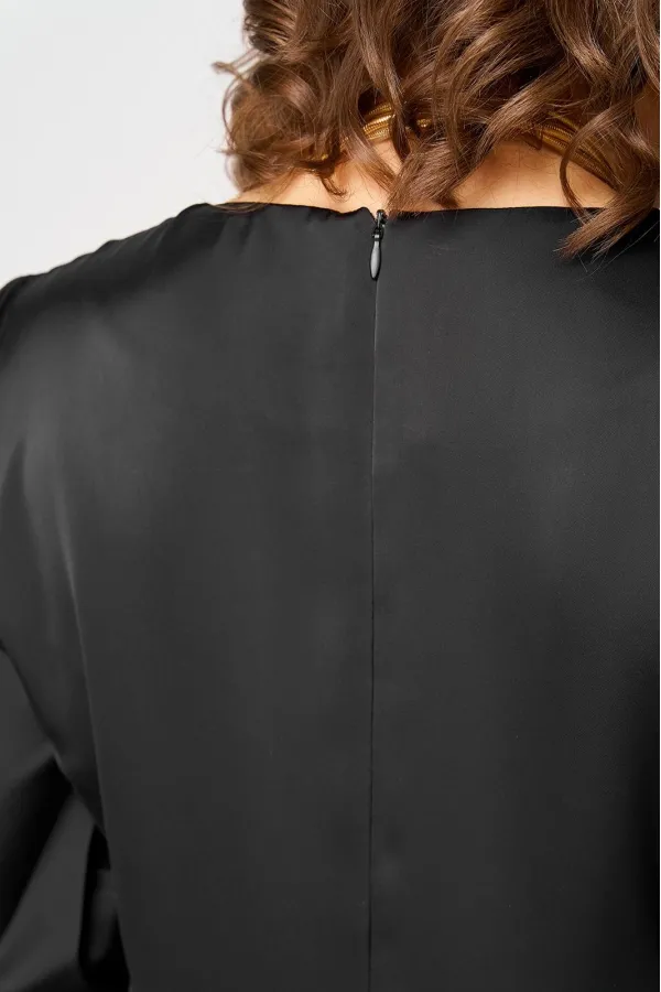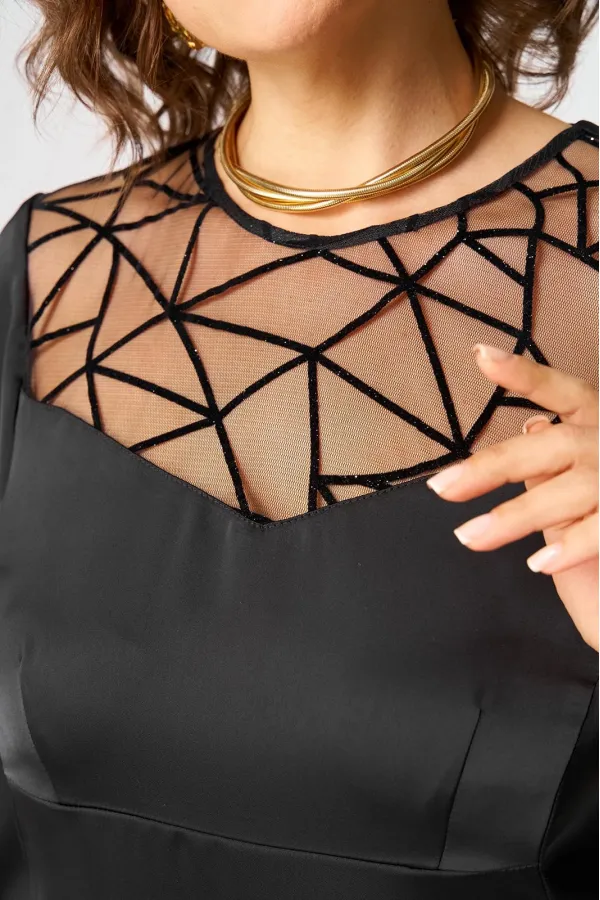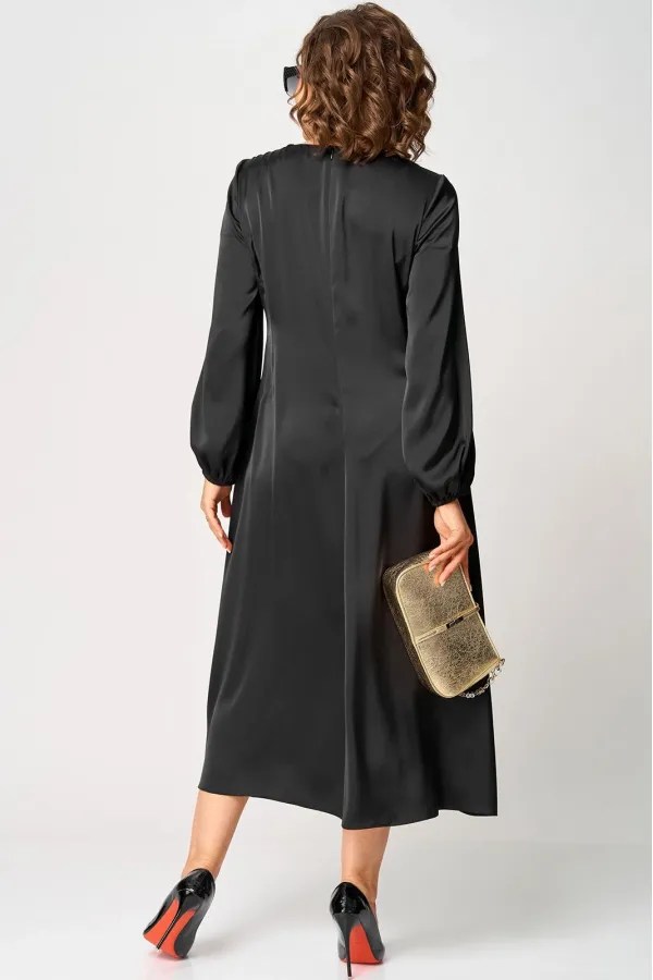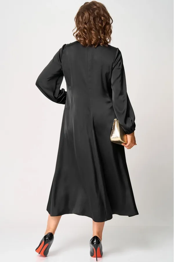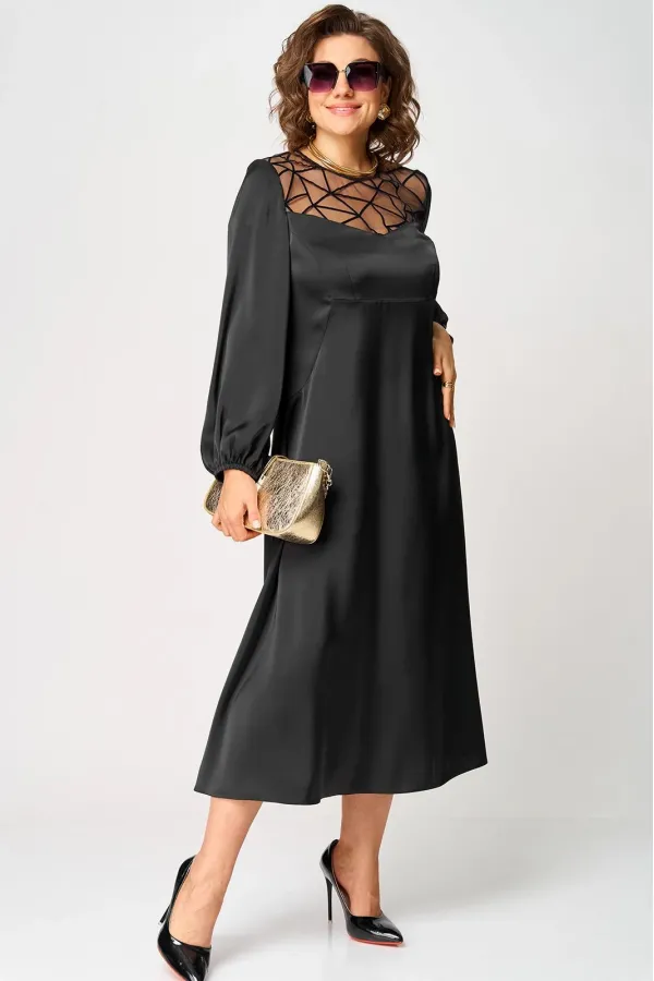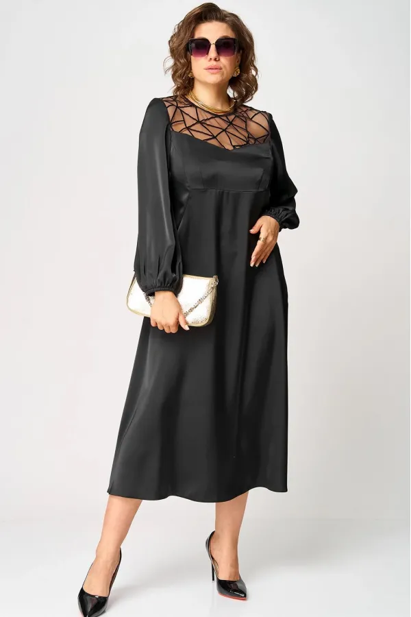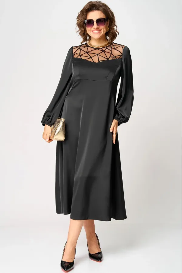 Платье женское нарядное полуприлегающего силуэта расширенное к низу. Выполнено из плательной ткани в сочетании с отделкой. Вырез горловины круглый обработан косой бейкой, рукав втачной по низу собран на притачной резинке. По переду платье отрезное по линии груди, верх отрезная фигурная кокетка из отделочной ткани, по спинке потайная тесьма молния. Декором платья служит кокетка из отделочной ткани по переду платья.