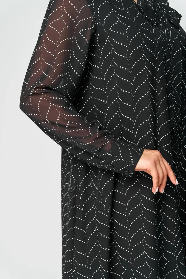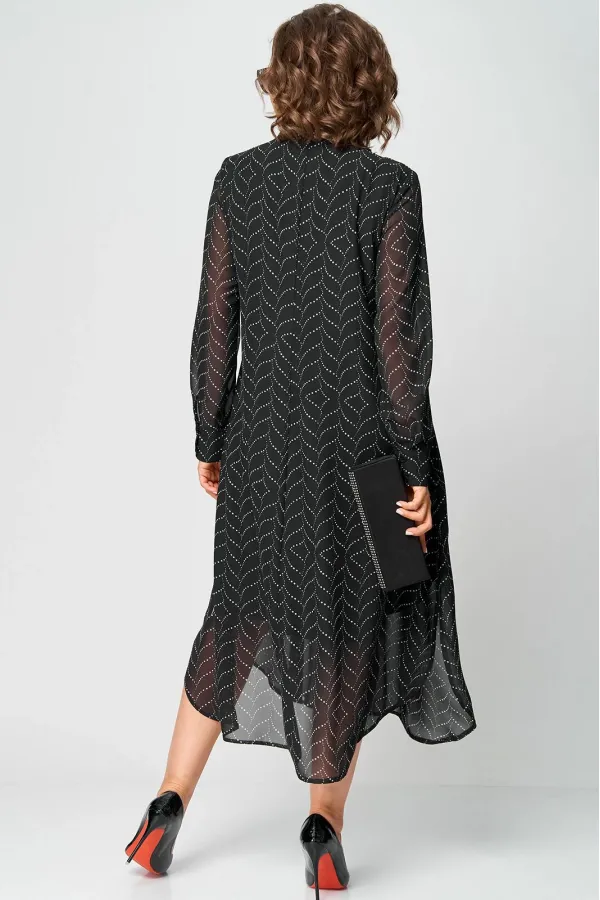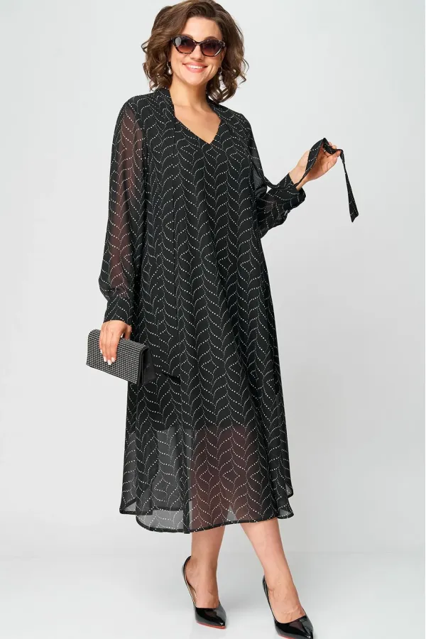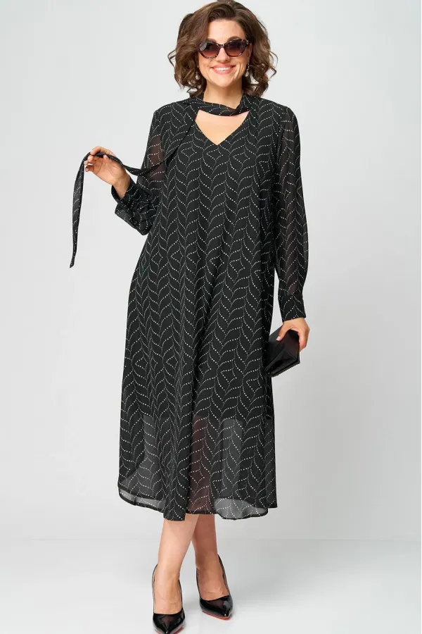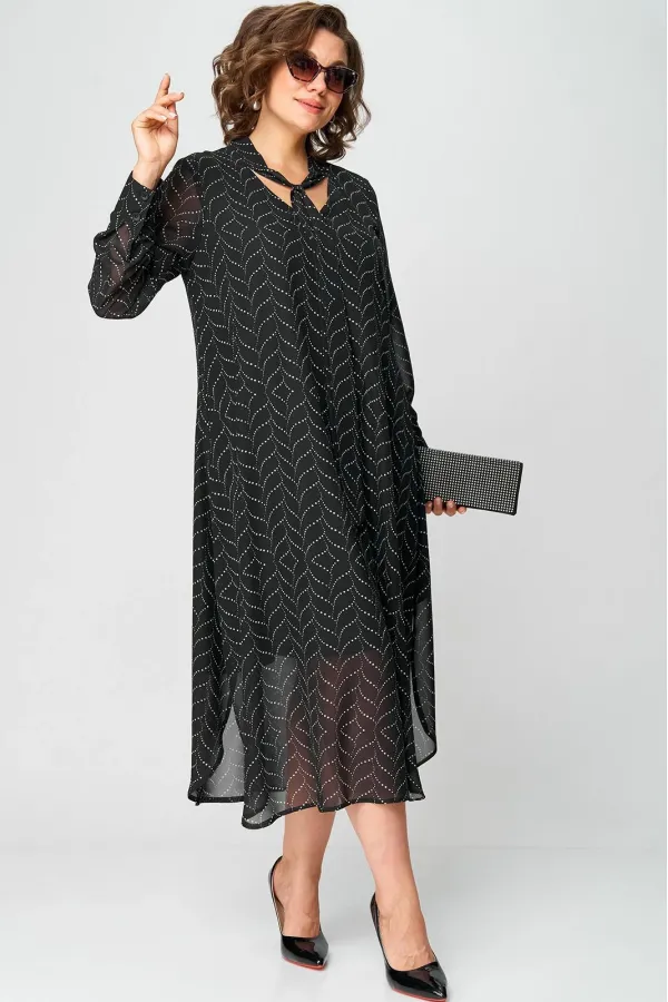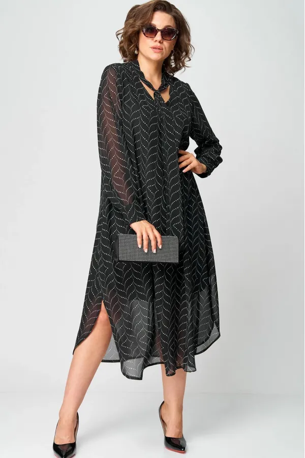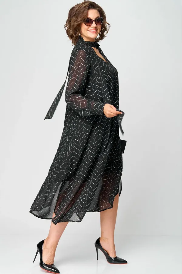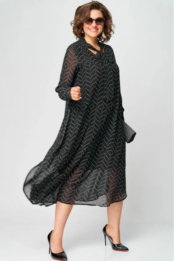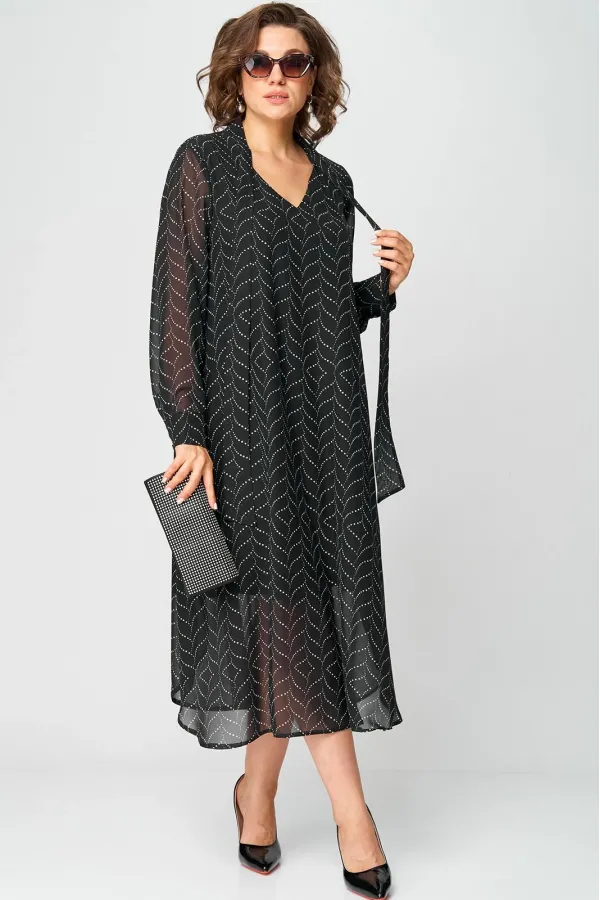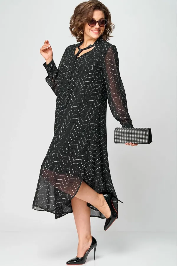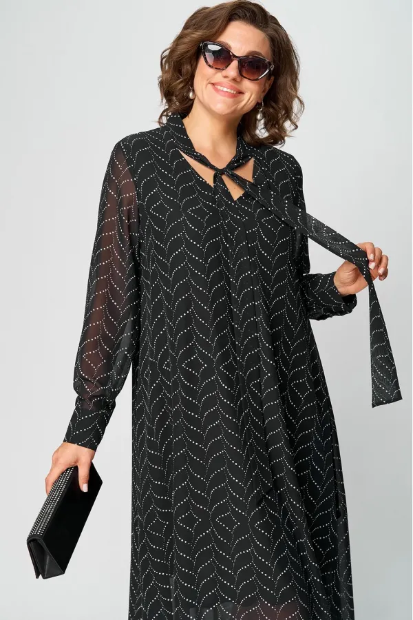 Платье женское нарядно-повседневное А-образного силуэта, выполнено из креп-шифона. Платье на трикотажной подкладке. Вырез горловины V-образный с втачной стойкой переходящей в бант. Рукав втаной по низу на притачной манжете. Декором платья служит принт самой ткани.