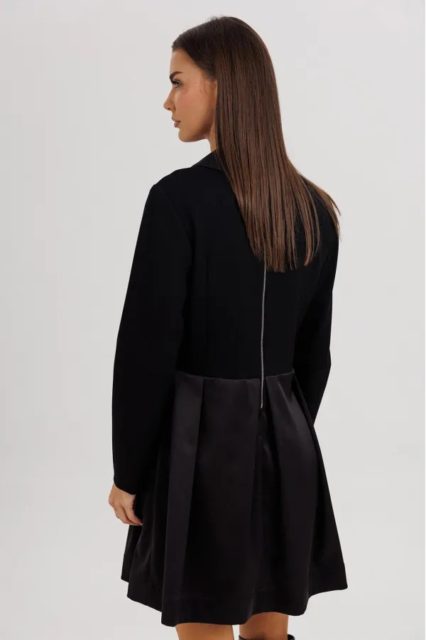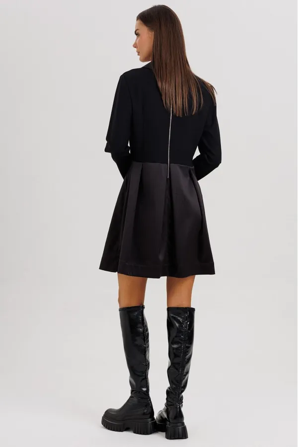 Лиф платья выполнен с талиевыми и нагрудной вытачкой, обеспечивая идеальную посадку, а юбка из гладкого атласа с мягкими складками создаёт лёгкий объём и женственный силуэт. На спинке — застёжка на отделочную молнию, добавляющая современный штрих.