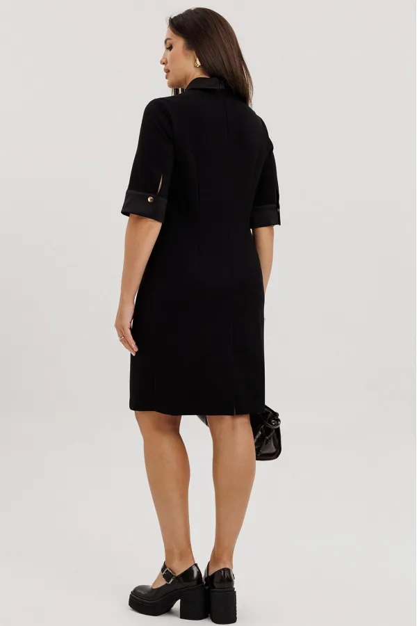 Детали: длина до колена, рукав ¾, строгий воротник с акцентной деталью.