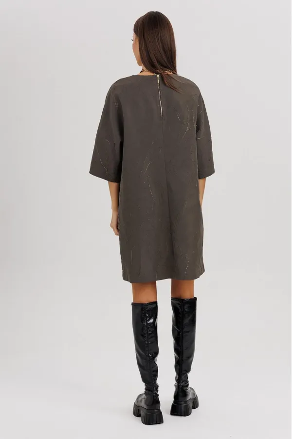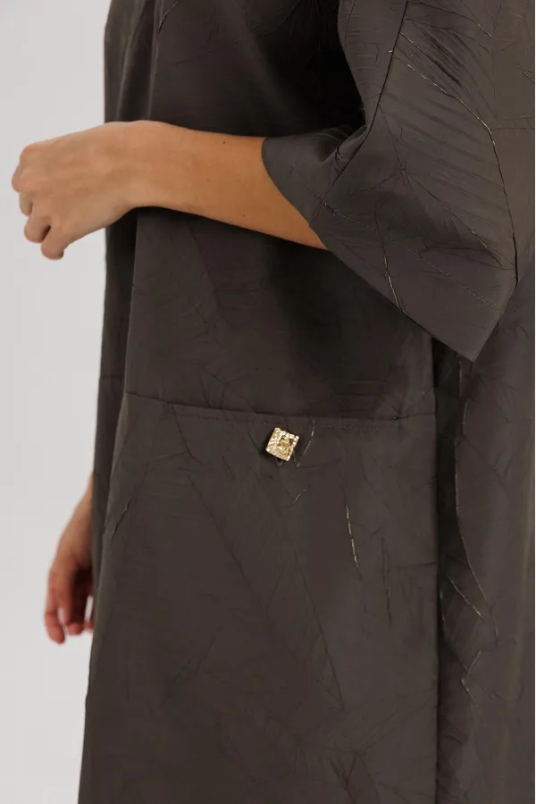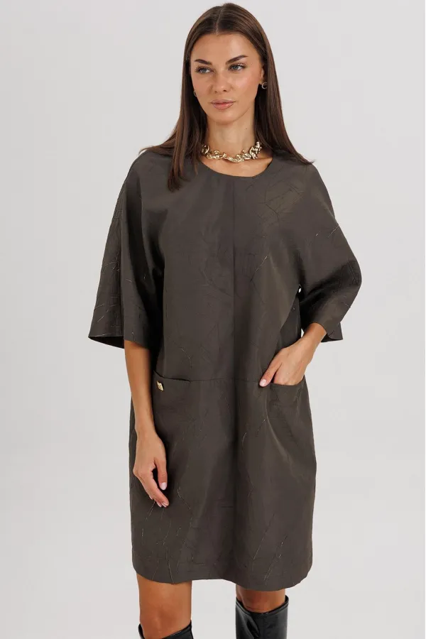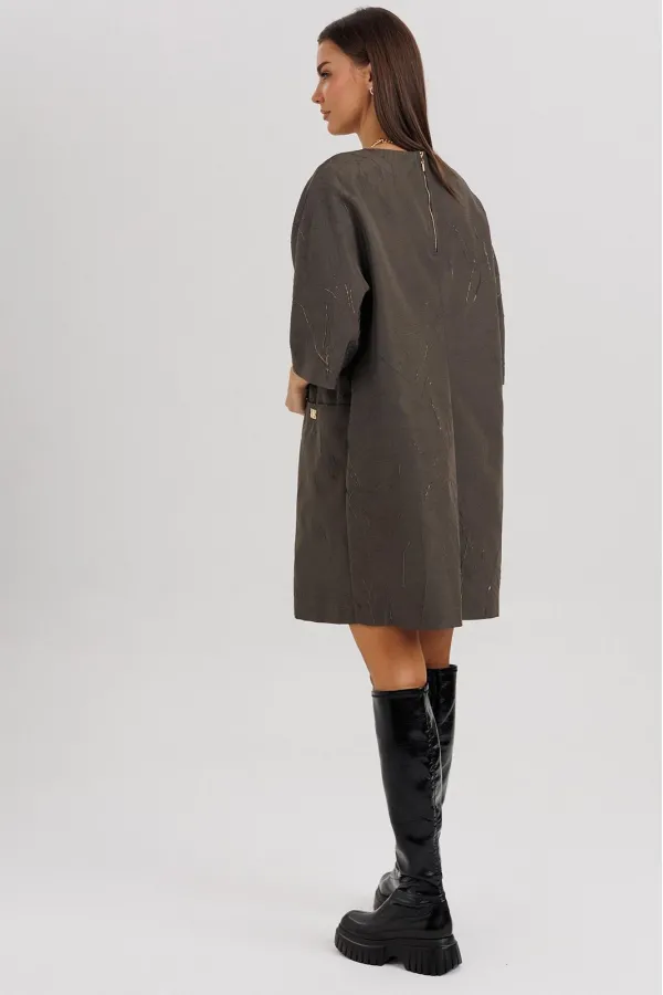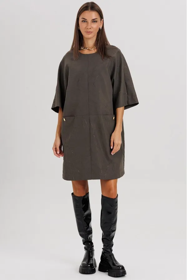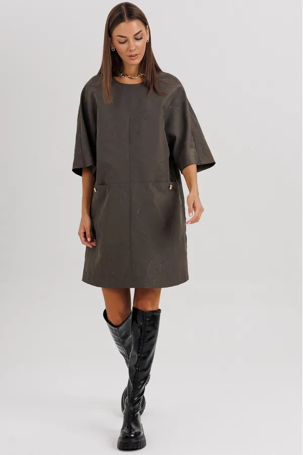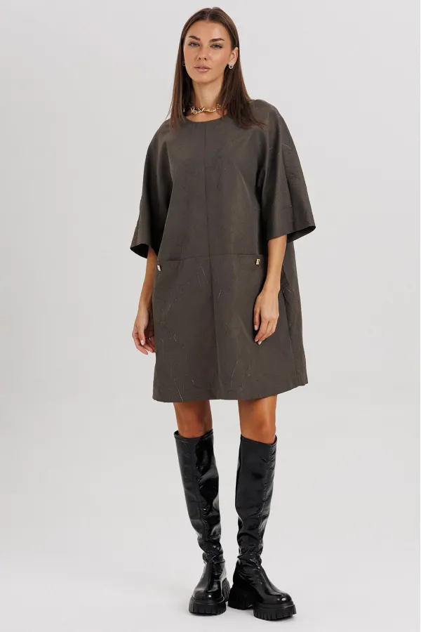 Платье имеет декоративные металлические элементы у линии карманов, что придает образу современный акцент. Универсальная длина до колена позволяет сочетать модель как с высокими сапогами, так и с ботильонами или обувью на плоской подошве.