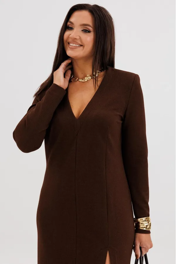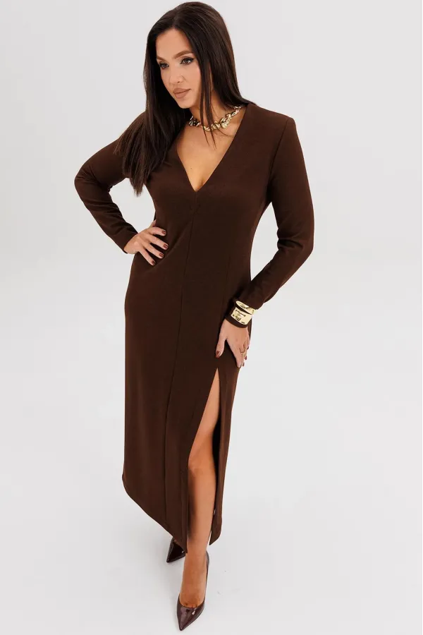 Шикарное платье из мягкого трикотажного полотна с едва заметным вкраплением люрекса — идеальное сочетание комфорта и элегантности. Втачной крой с лёгким прилеганием подчёркивает силуэт, а асимметричный рельеф визуально вытягивает фигуру, добавляя образу динамики. Глубокий V-вырез создаёт женственный акцент, а эффектный разрез спереди придаёт образу уверенность и утончённую привлекательность.