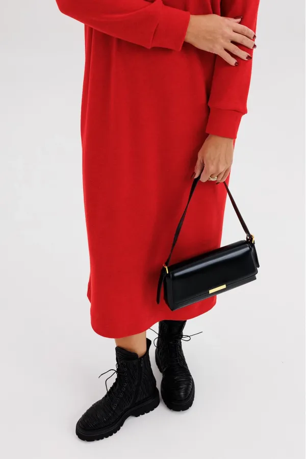 Мягкая фактура ткани приятна к телу и подходит для любого сезона. Насыщенный красный цвет подчёркивает женственность и уверенность, а минималистичный стиль позволяет комбинировать платье с различными аксессуарами и обувью — от классических туфель до ботильонов.