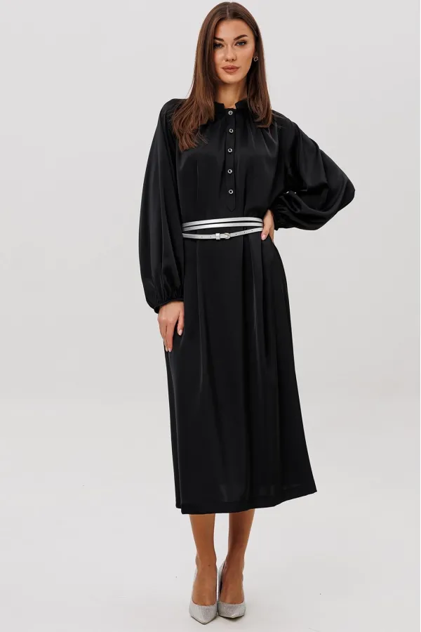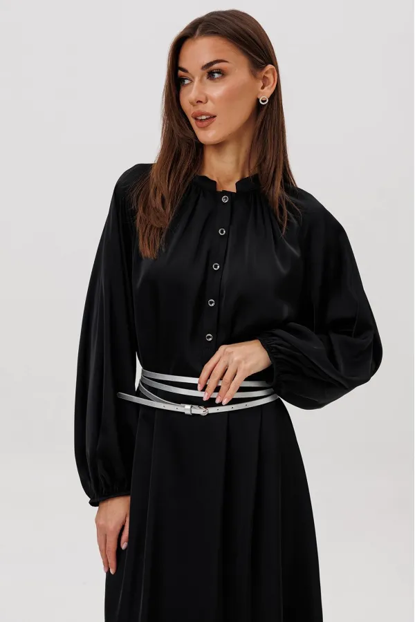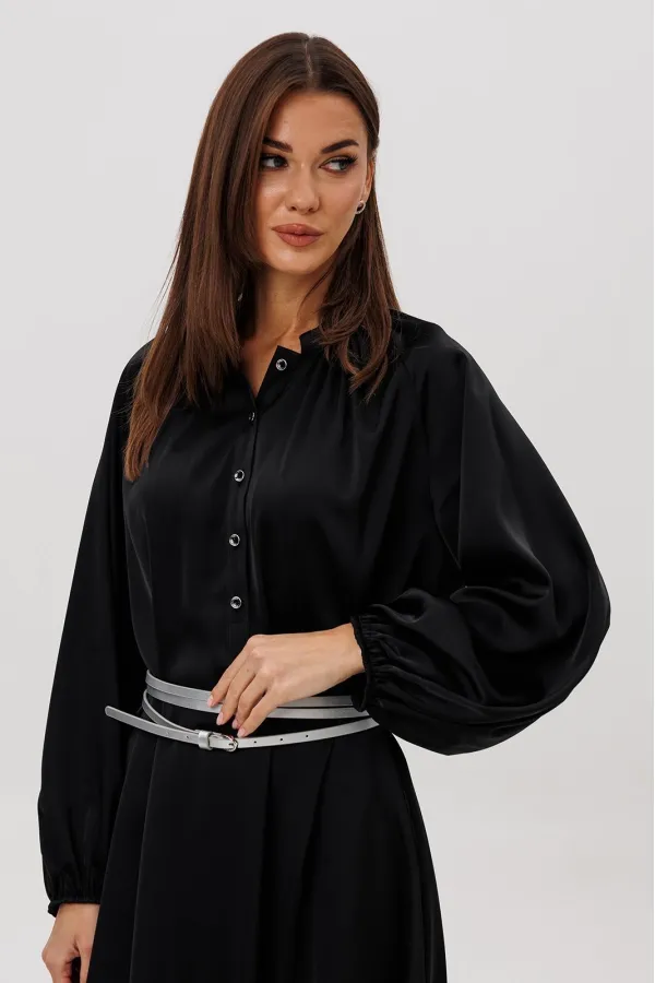 Платье из гладкого атласного полотна свободного рубашечного покроя. Модель выполнена с мягкой сборкой по горловине, застёжкой на пуговицы и объёмными рукавами на манжете. Акцентом выступают эффектные серебристые пояса, подчёркивающие талию и добавляющие образу современный, элегантный штрих. Ideal для деловых встреч, ужинов и особых выходов.