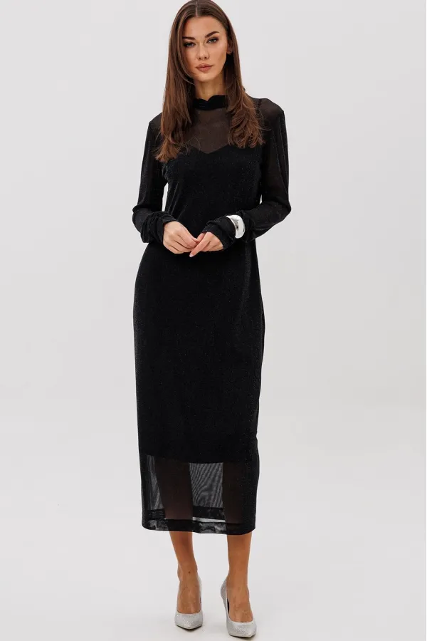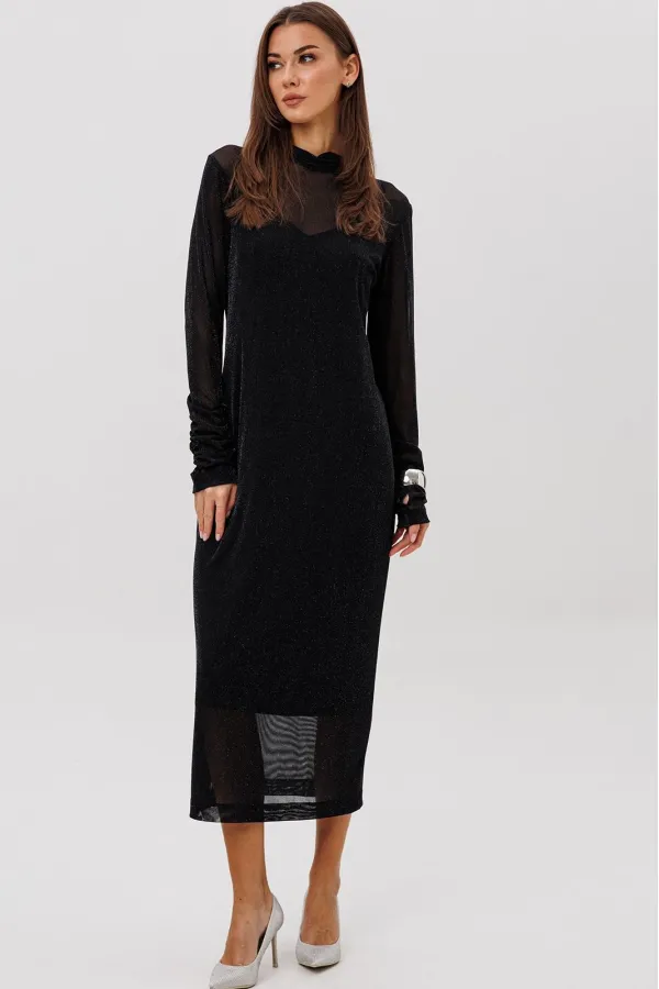 Женственное платье втачного покроя выполнено из мерцающей сетки, красиво играющей при движении. Драпированные рукава и стоячий воротник добавляют утончённости, а подкладка-чехол обеспечивает комфорт и идеальную посадку. Образ одновременно выдержанный, современный и эффектный.
