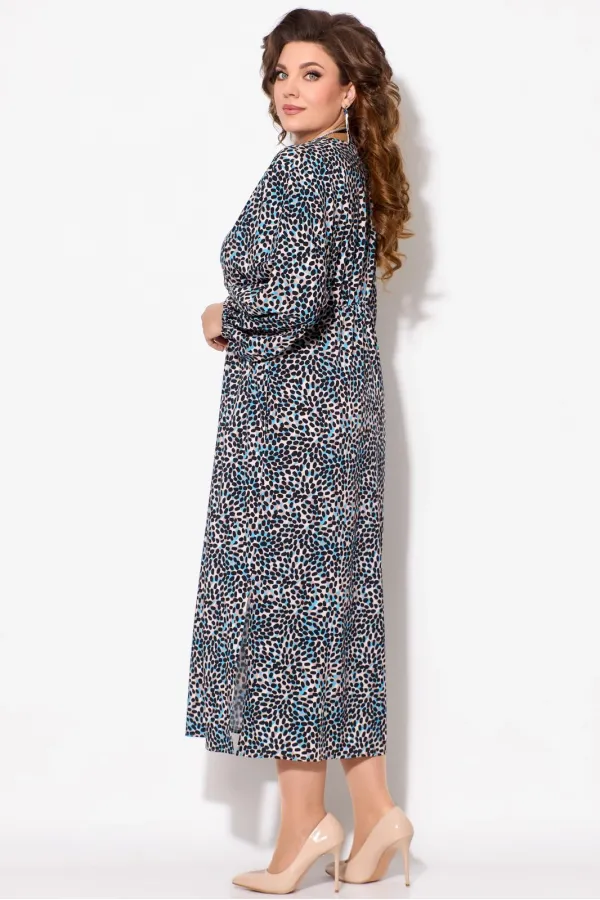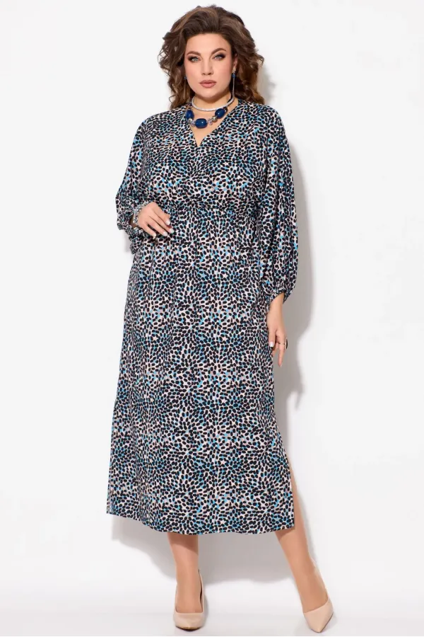 Элегантное женское платье Лютица, длина миди. Прямого силуэта. Горловина V-образной формы, на запах. Выше линии талии обработан подрез. Верхняя часть платья собрана на резинку. Рукав цельнокроеный, длинный, расширенный к низу. Низ рукава собран на резинку. В боковых швах обработаны разрезы.