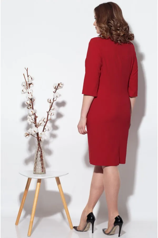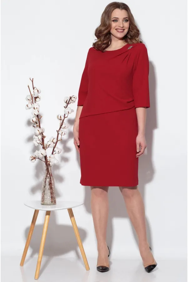 Платье женское, полуприлегающего силуэта, выполнено из трикотажного синтетического полотна. По переду платье имеет ассиметричный горизонтальный подрез с мягкими складками. На левом плече имеются дополнительные складки направленные вниз, украшенные брошью. Верхняя часть переда платья на трикотажной подкладке. Спинка со средним швом и маленьким разрезом внизу. Рукав 3/4, может быть коротким. Длина платья по спинке в размерах, 48-52: 98 см (+/- 1 см), 54-58: 105 см (+/- 1 см).
