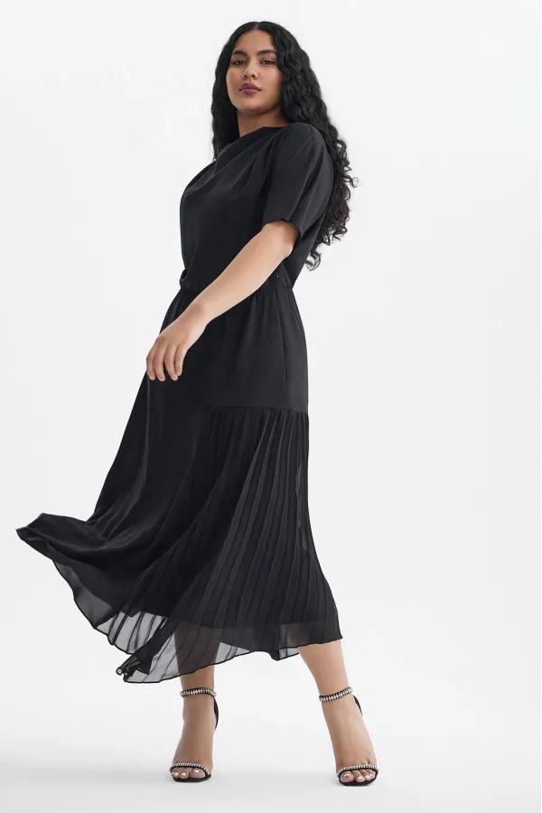 Платье отрезное по линии талии, без воротника, с застежкой на навесную петлю и пуговицу по спинке и потайную молнию в левом боковом шве. Горловина переда с драпировкой-качель, по плечевым швам переда две бантовые складки. Шов по талии присборен на резинку. Верхняя часть спинки со средним швом, разрезом по среднему шву в области горловины. Нижняя часть платья с отрезной кокеткой, асимметричной вставкой- гофре. Рукав короткий, цельнокроенный.