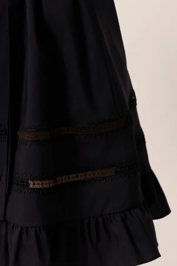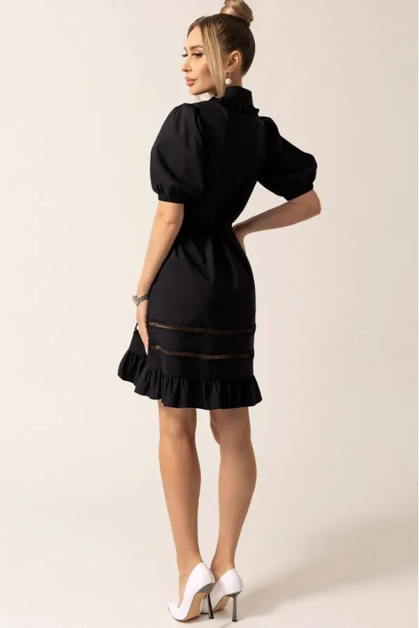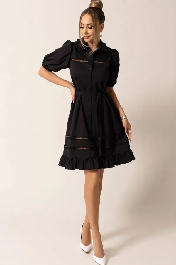 Платье с центральной застежкой на петли и пуговицы, отложным воротником. По краю воротника- рюша. Полочки и спинка декорированы втачными кружевными деталями. По низу платья- рюша. Рукав короткий, втачной, со сборкой по о... Читать далее...