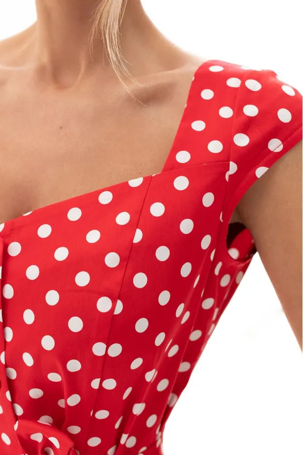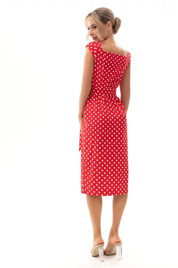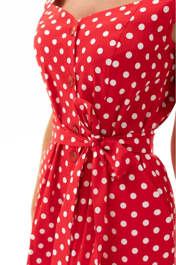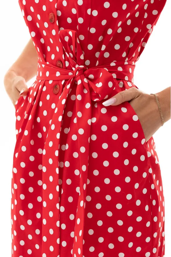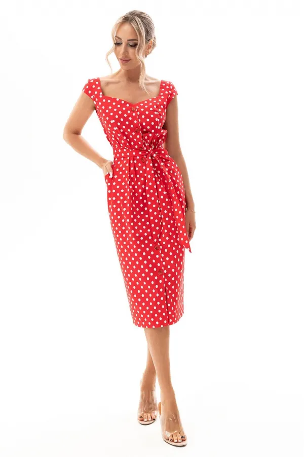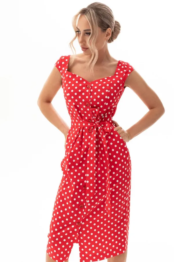 Платье с центральной застежкой на петли и пуговицы, с фигурным вырезом горловины. Платье отрезное по линии талии. Верхняя часть переда с рельефами, выходящими из горловины, нижняя часть переда с карманами и односторонними складками по талии. Верхняя часть спинки с рельефами, выходящими из горловины. Нижняя деталь спинки с талиевыми вытачками. Платье со съемным поясом. Рукав- крылышко.