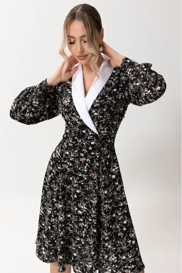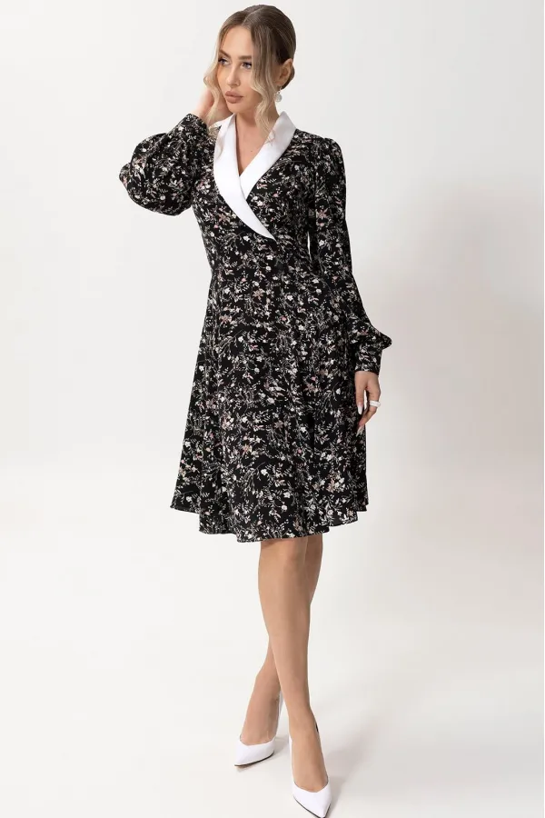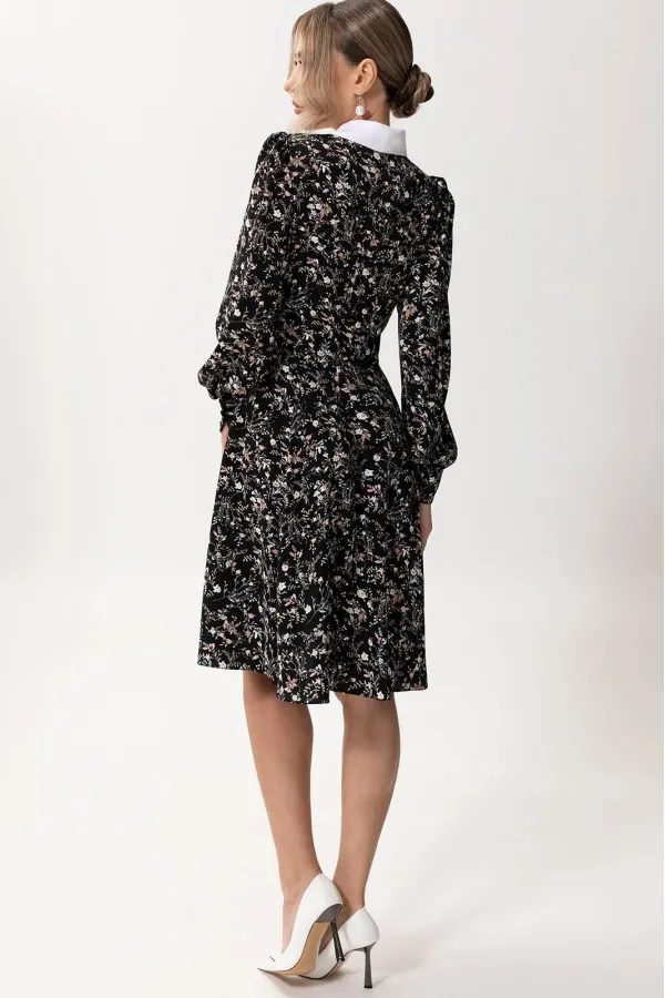 Цветовая гамма для верха, подкладки, фурнитуры, отделки: платье из ткани с цветочным рисунком. Воротник контрастен основной ткани.